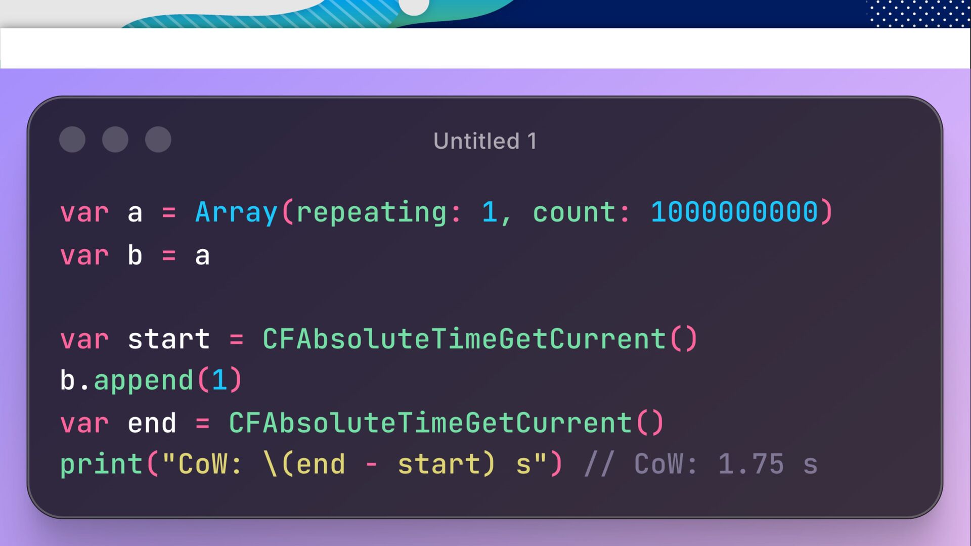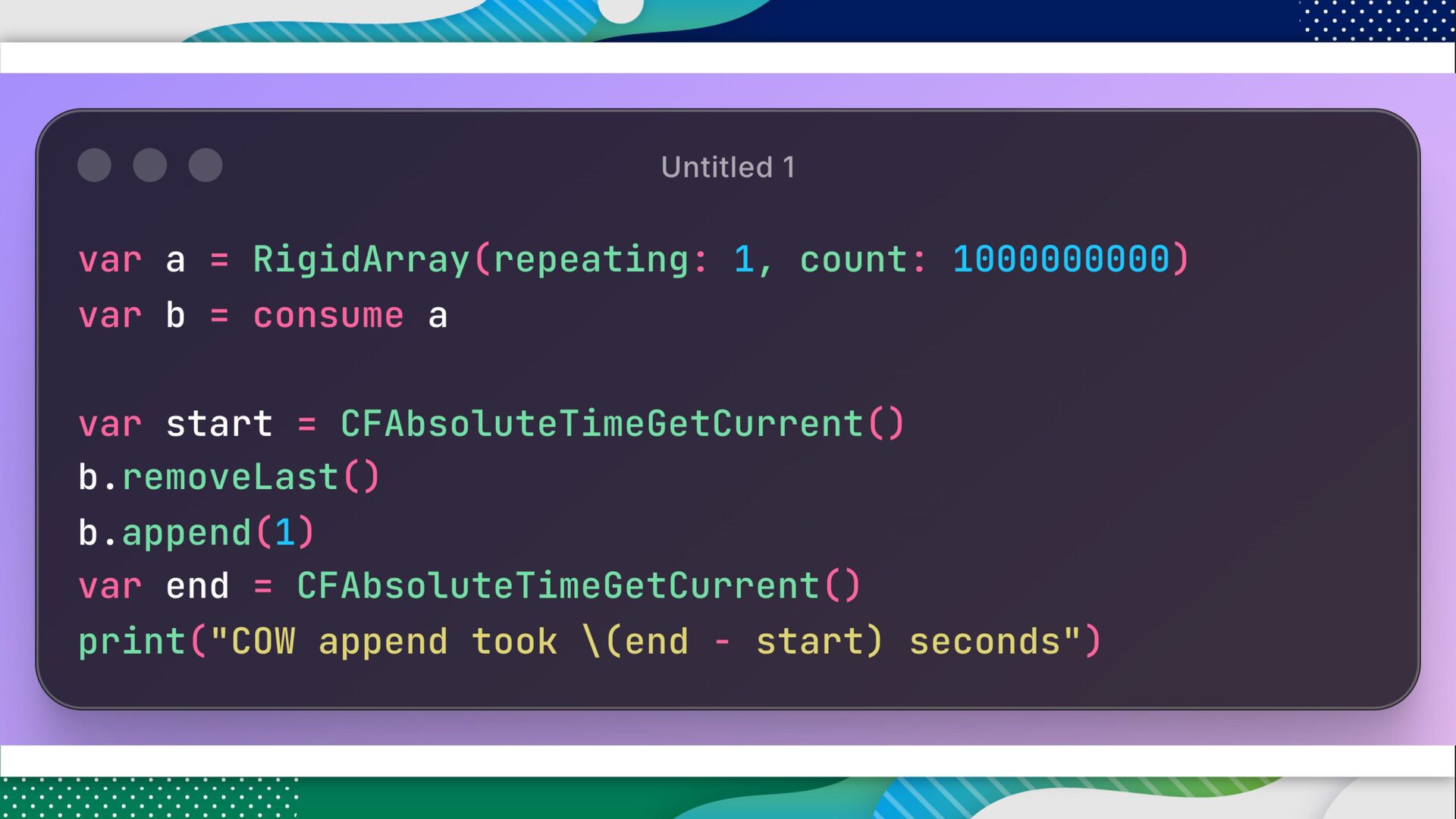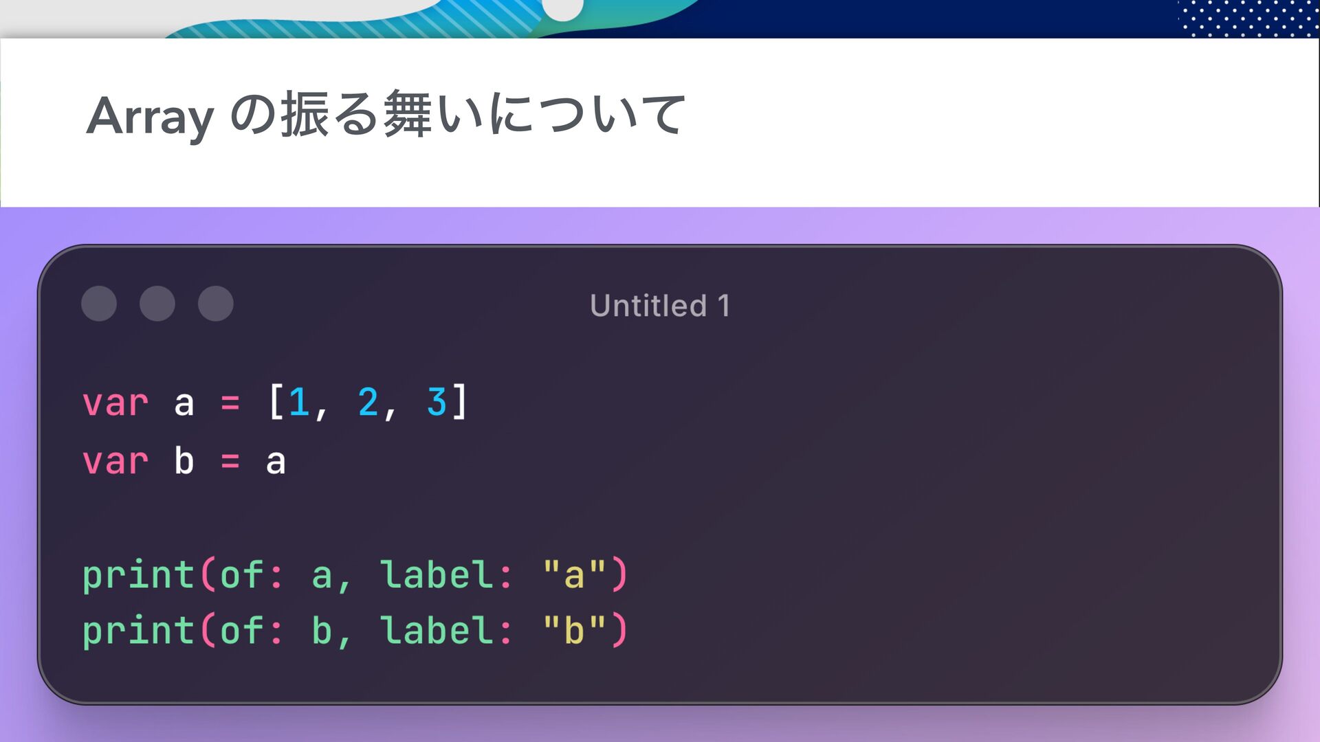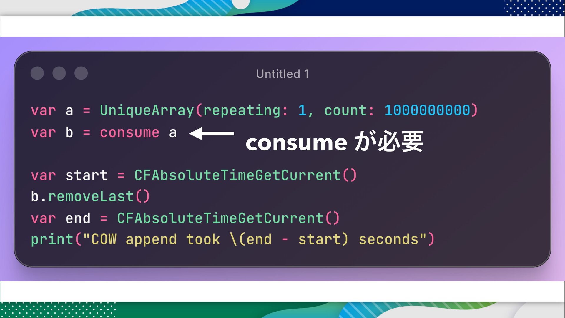 UniqueArray ʹ͍ͭͯ • ʮίϐʔͰ͖ͳ͍ಈతྻʯ • Array ͷ Copy-on-Write (CoW) ͕ഇࢭ͞Ε͍ͯΔ
