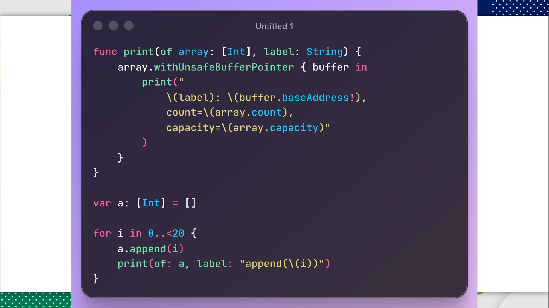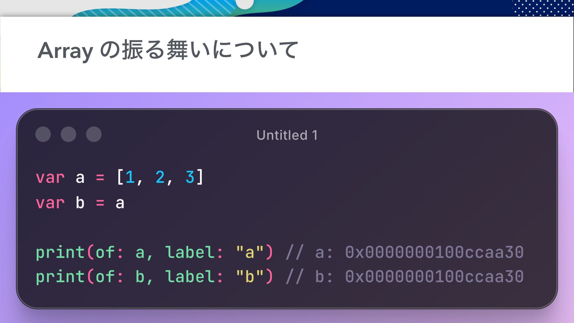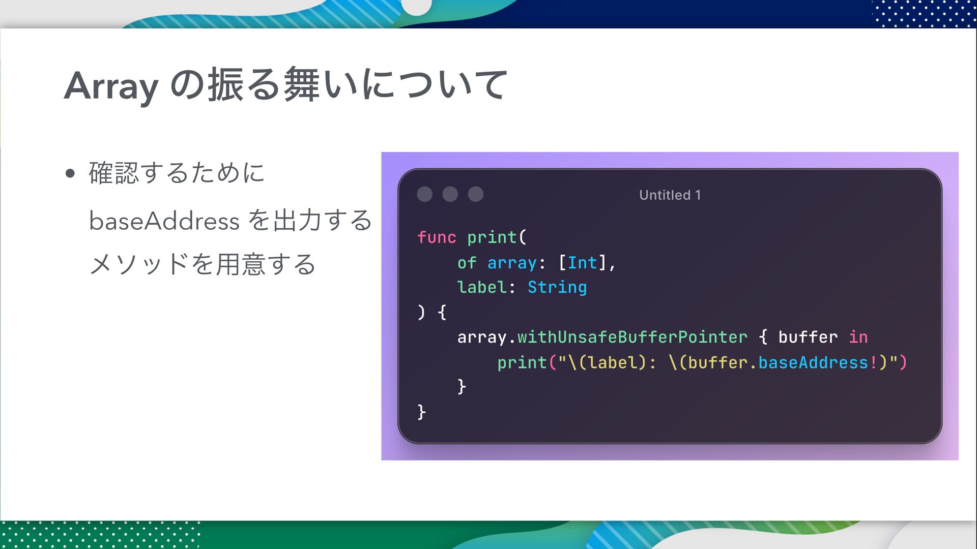 Array ͷৼΔ͍ʹ͍ͭͯ • ֬ೝ͢ΔͨΊʹ baseAddress Λग़ྗ͢Δ ϝιουΛ༻ҙ͢Δ