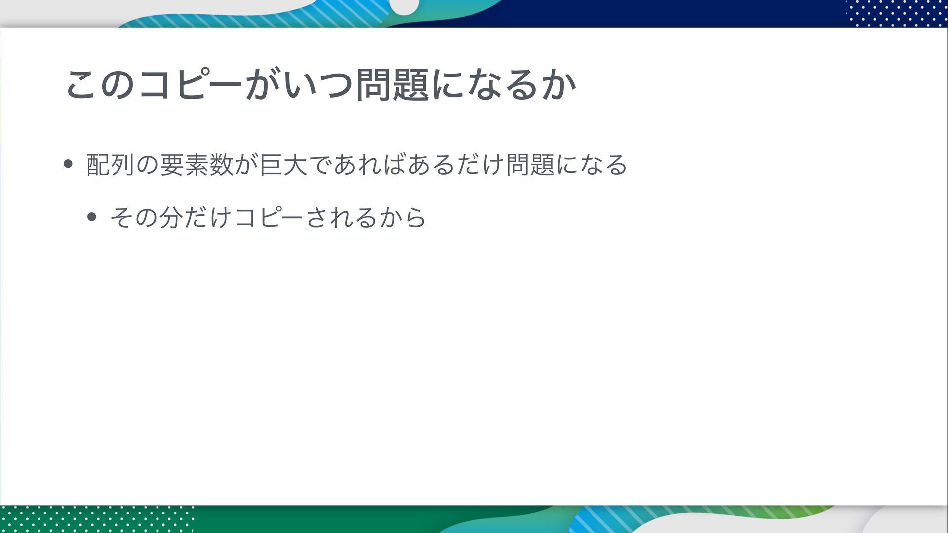 ·ͱΊ • Array ൚༻ͰศརͰ͋Δ͕ɺڊେͳྻΛѻ͏߹ʹ CoW ʹΑΔί ετ reallocation ʹΑΔίετཱ͕ͭ •