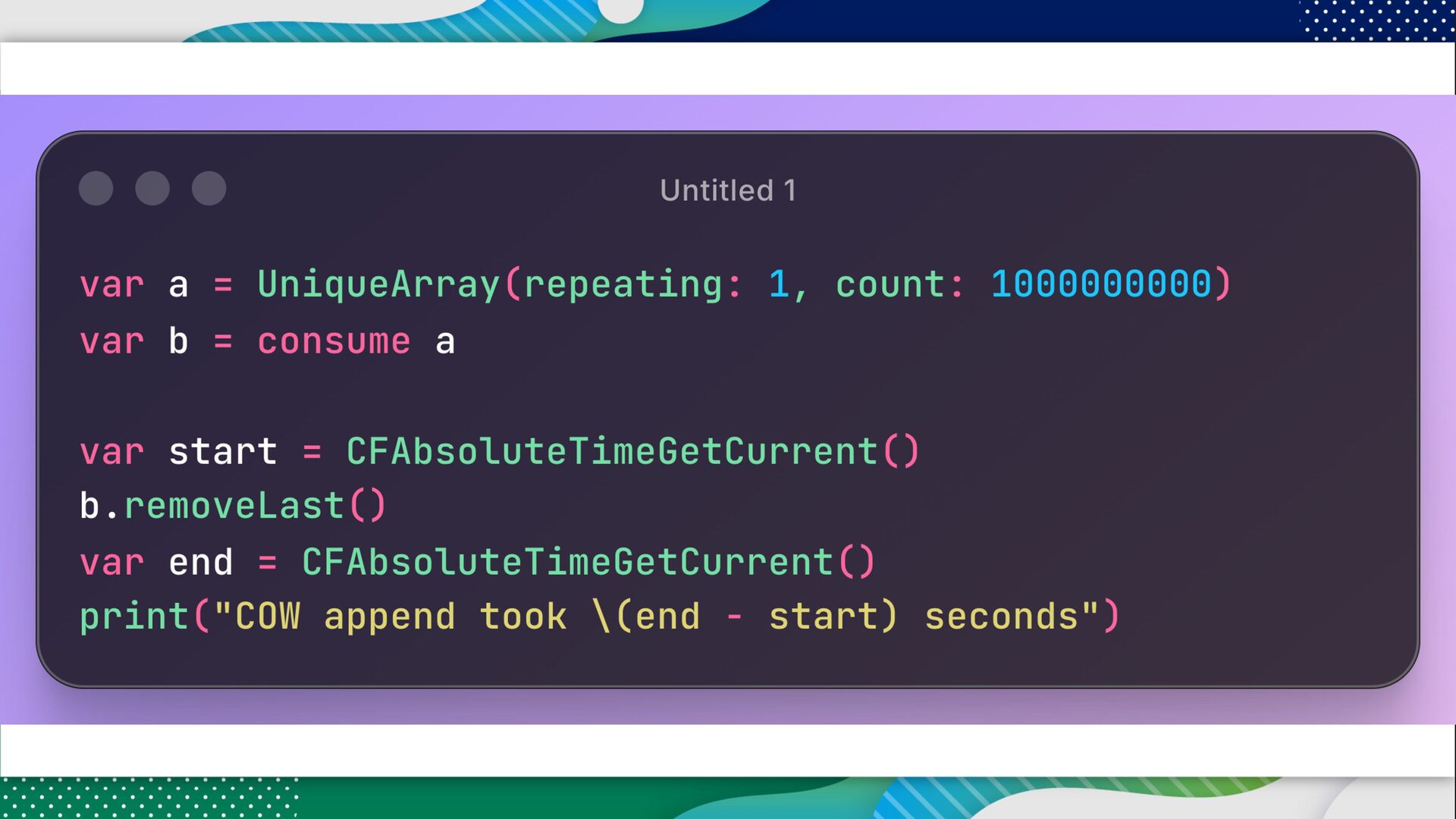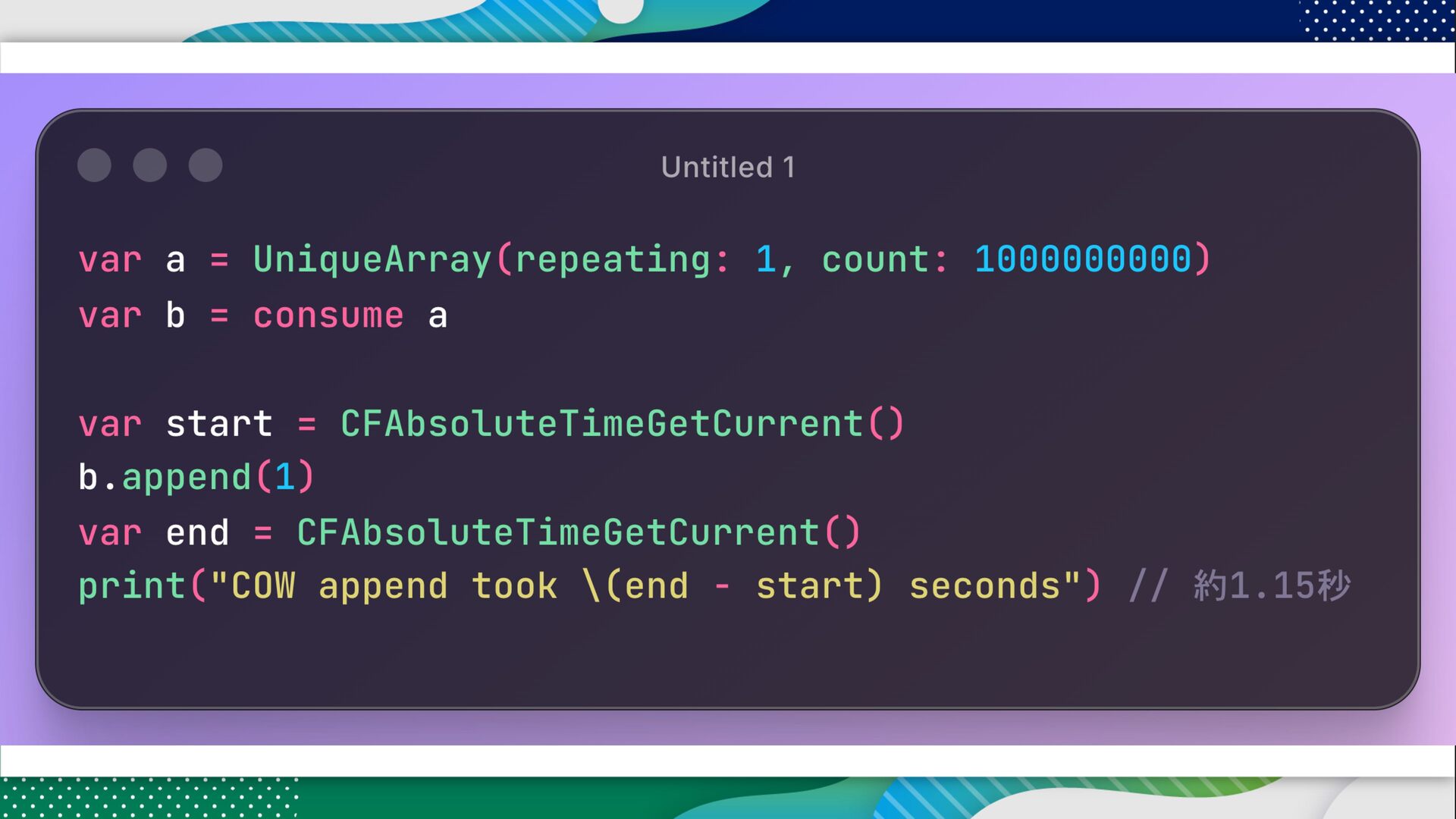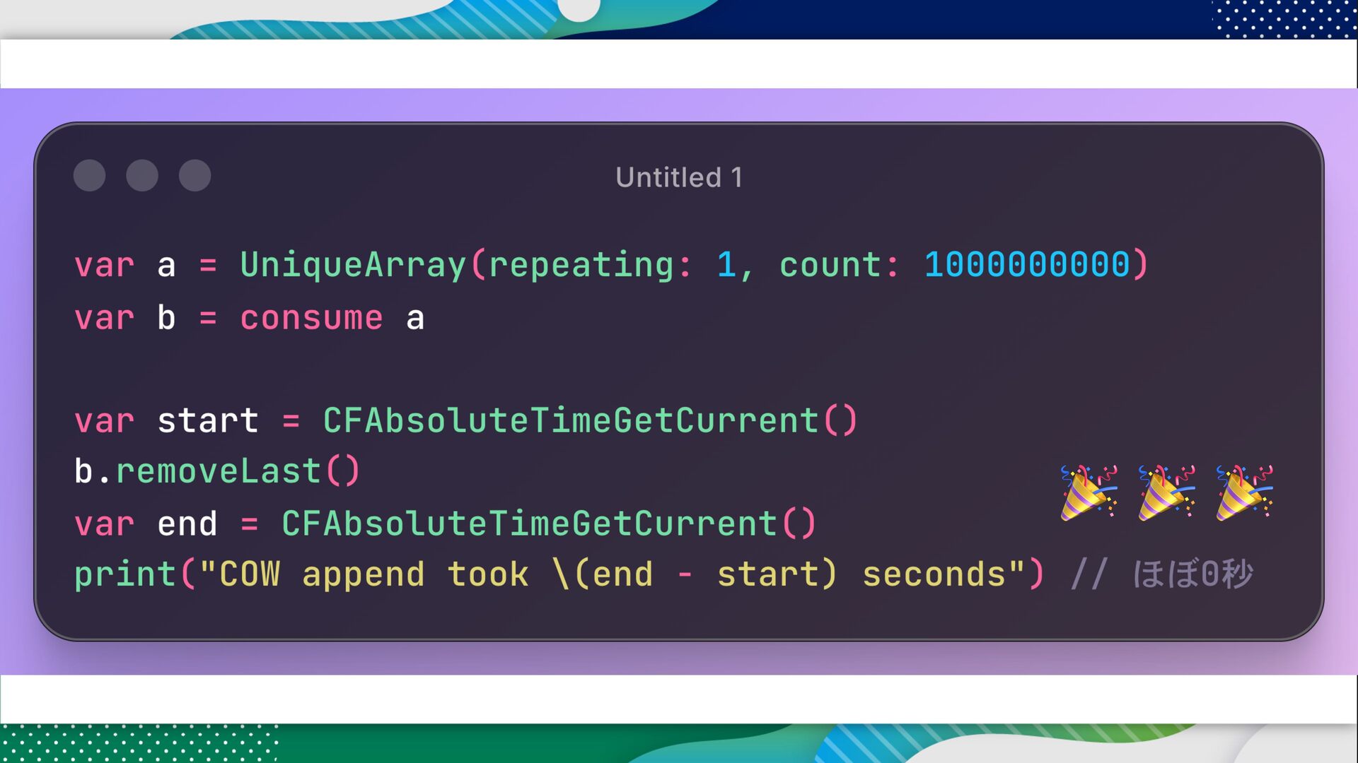 ͦ͜Ͱ UniqueArray • ʮίϐʔͰ͖ͳ͍ಈతྻʯ • Array ͷ Copy-on-Write (CoW) ͕ഇࢭ͞Ε͍ͯΔ