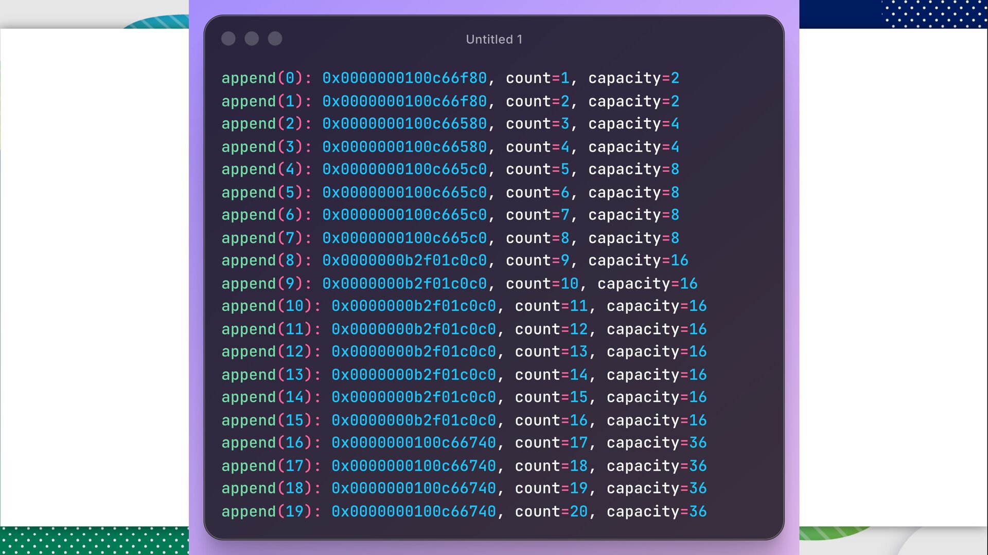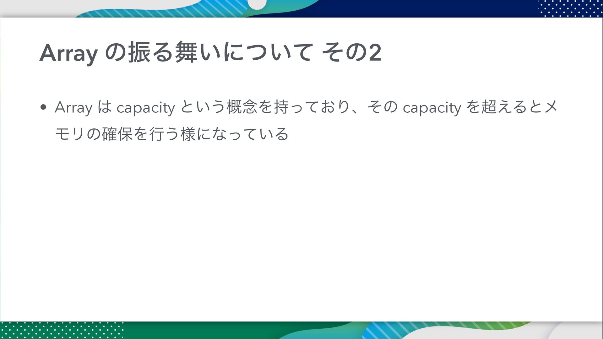 Array ͷৼΔ͍ʹ͍ͭͯ ͦͷ2 • Array capacity ͱ͍͏֓೦Λ͓࣋ͬͯΓɺͦͷ capacity Λ͑Δͱϝ