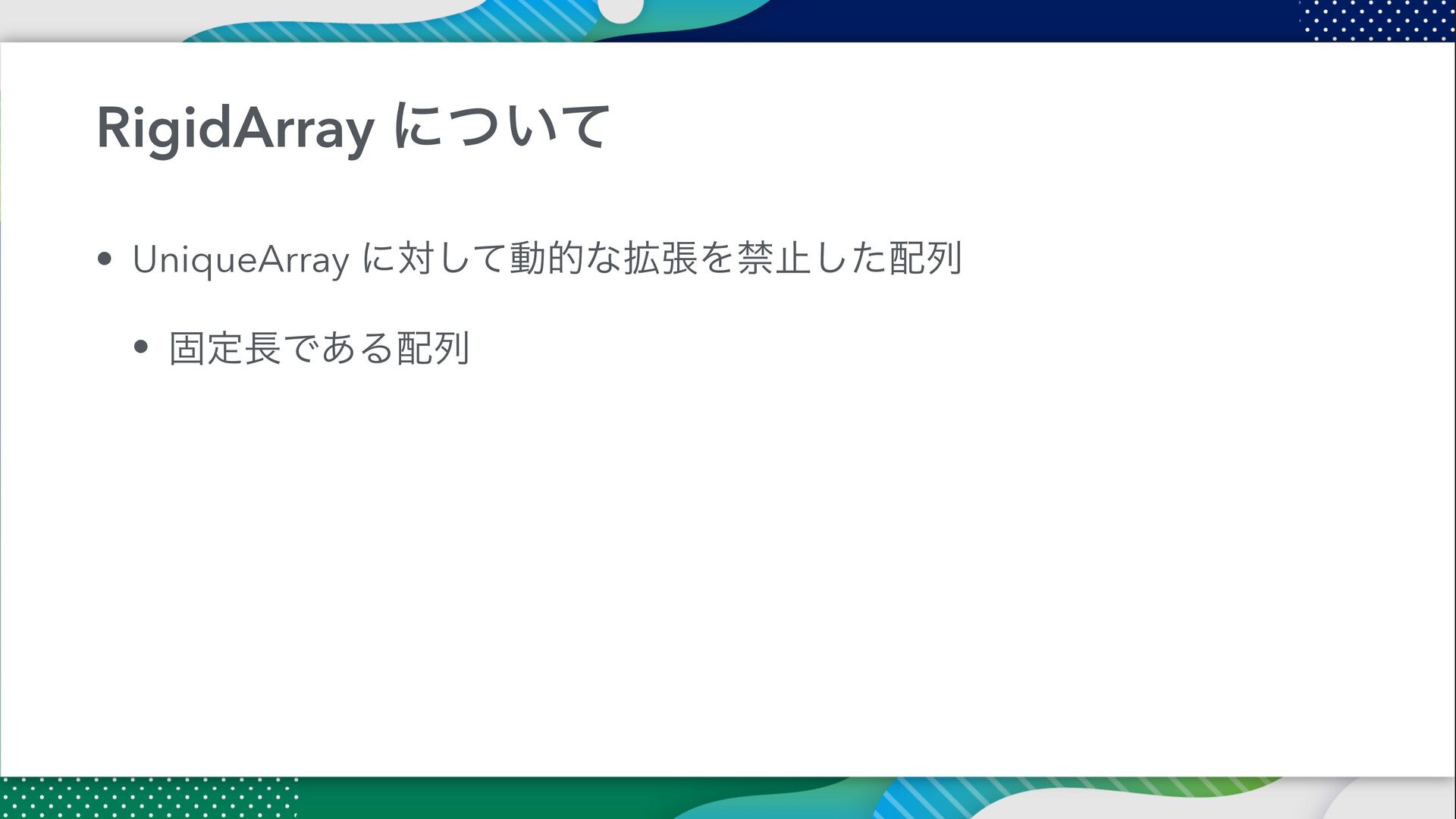 RigidArray ʹ͍ͭͯ • UniqueArray ʹରͯ͠ಈతͳ֦ுΛېࢭͨ͠ྻ • ݻఆͰ͋Δྻ