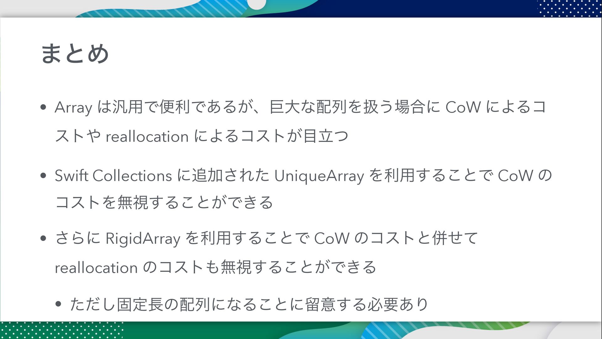 Swift Collections ʹՃ͞Εͨ UniqueArray Λར༻͢Δ͜ͱͰ CoW ͷ ίετΛແࢹ͢Δ͜ͱ͕Ͱ͖Δ • ͞Βʹ RigidArray Λར༻͢Δ͜ͱͰ CoW ͷίετͱซͤͯ reallocation ͷίετແࢹ͢Δ͜ͱ͕Ͱ͖Δ • ͨͩ͠ݻఆͷྻʹͳΔ͜ͱʹཹҙ͢Δඞཁ͋Γ