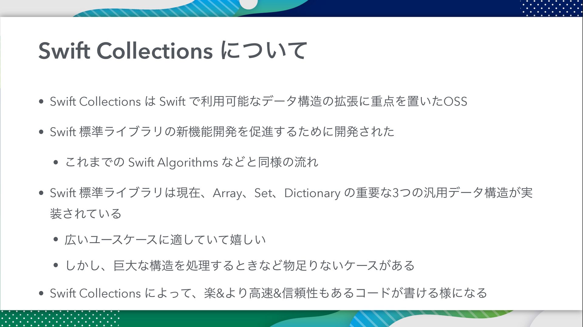 Swift ඪ४ϥΠϒϥϦͷ৽ػೳ։ൃΛଅਐ͢ΔͨΊʹ։ൃ͞Εͨ • ͜Ε·Ͱͷ Swift Algorithms ͳͲͱಉ༷ͷྲྀΕ • Swift ඪ४ϥΠϒϥϦݱࡏɺArrayɺSetɺDictionary ͷॏཁͳ3ͭͷ൚༻σʔλߏ͕࣮ ͞Ε͍ͯΔ • ͍Ϣʔεέʔεʹద͍ͯͯ͠خ͍͠ • ͔͠͠ɺڊେͳߏΛॲཧ͢Δͱ͖ͳͲΓͳ͍έʔε͕͋Δ • Swift Collections ʹΑͬͯɺָ&ΑΓߴ&৴པੑ͋Δίʔυ͕ॻ͚Δ༷ʹͳΔ