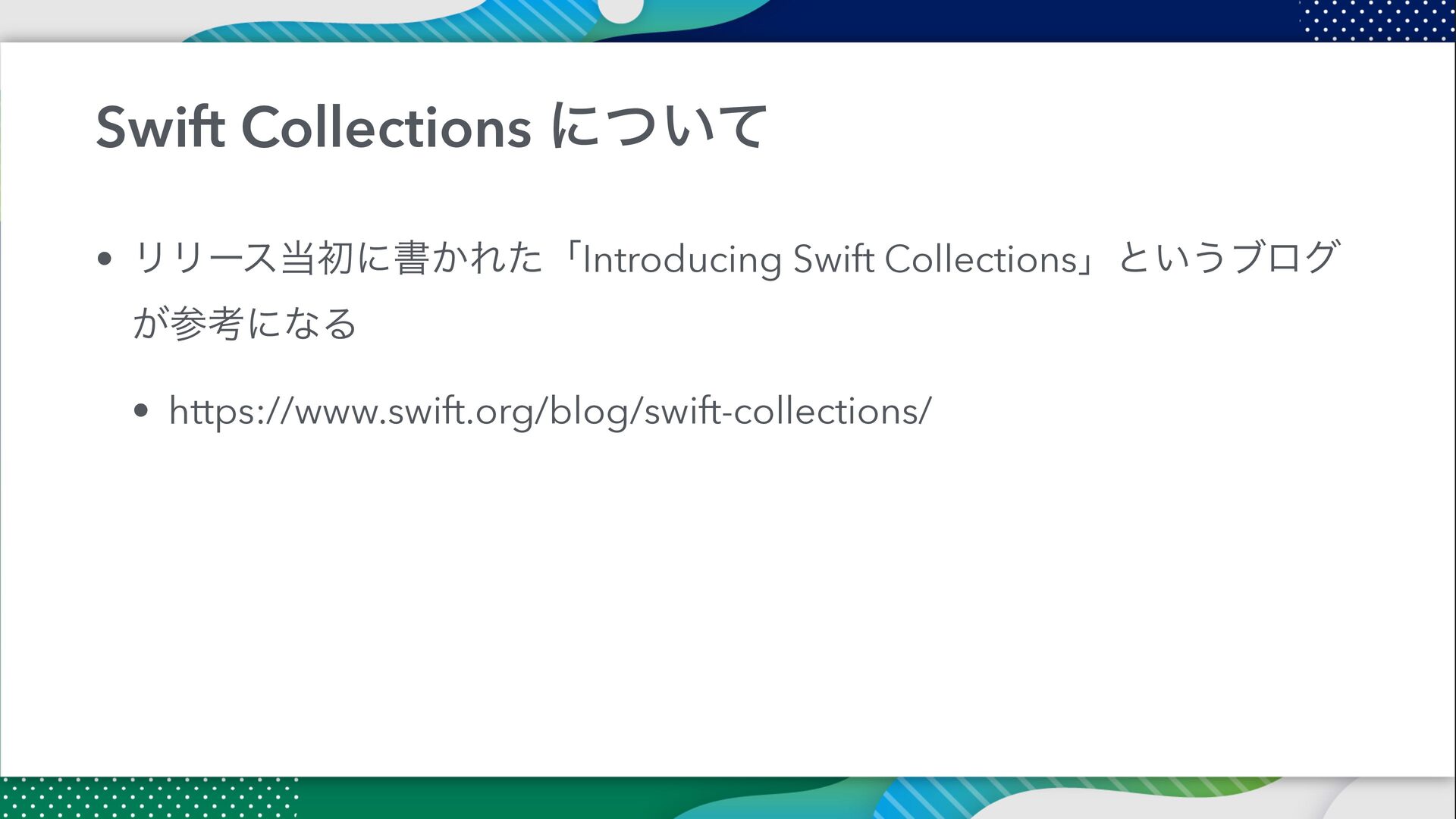 Swift Collections ʹ͍ͭͯ • ϦϦʔεॳʹॻ͔ΕͨʮIntroducing Swift Collectionsʯͱ͍͏ϒϩά ͕ࢀߟʹͳΔ • https://www.swift.org/blog/swift-collections/