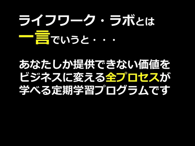 第12回 ライフワークで生きるための 4つのステップの上がり方 目的‐タスク‐行動 実行力を倍増させる方法 自分探しを終わらせる 脱トラベラー論 お客様を動かすただ1つの 要素 ‐BASマーケティング‐ ライフワークをお金にかえる フロント‐ミドル‐バックの モデルの作り方 各SNSの特徴と活用方法 お客様があなたから買う理由 ベネフィットの創り方 価値を生み出す錬金術 リサーチの極意 ビジネスの成功は映画にあり ストーリー型目的設定法 一撃で興味を持たれる キャッチコピー術 第10回 第11回 7日間でライフワークを形にして ビジネスをスタートさせる方法 あなたの大好きなことで 売れる有料商品をつくる 第12回 来たいお客様を絞り込める Facebook広告の設定方法の秘訣