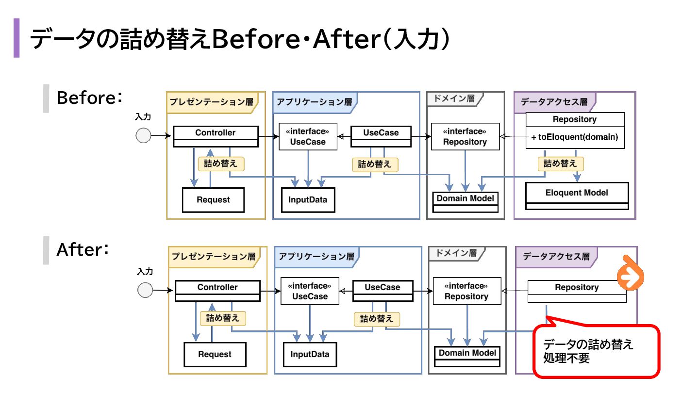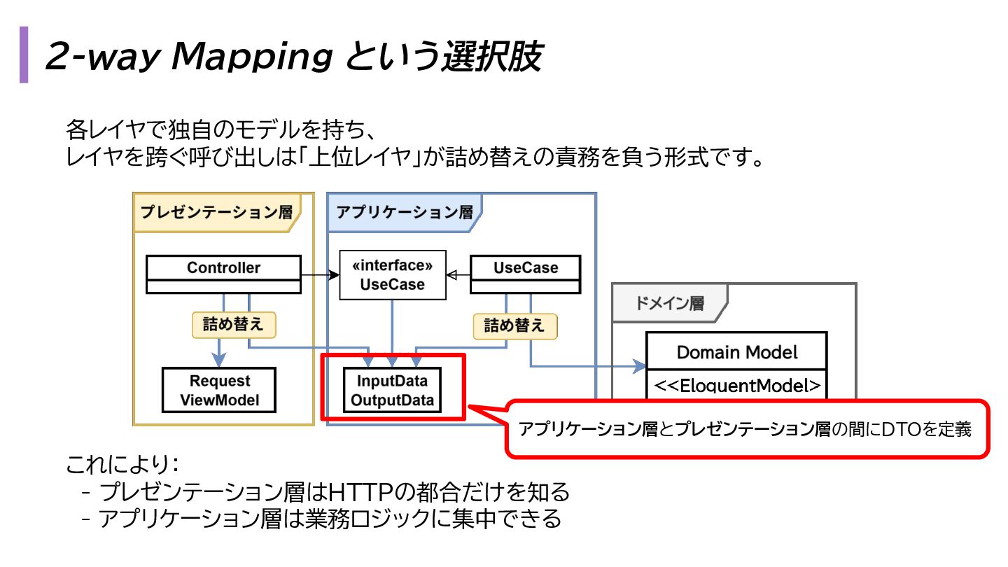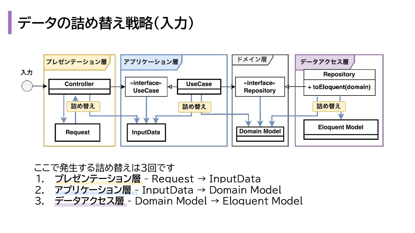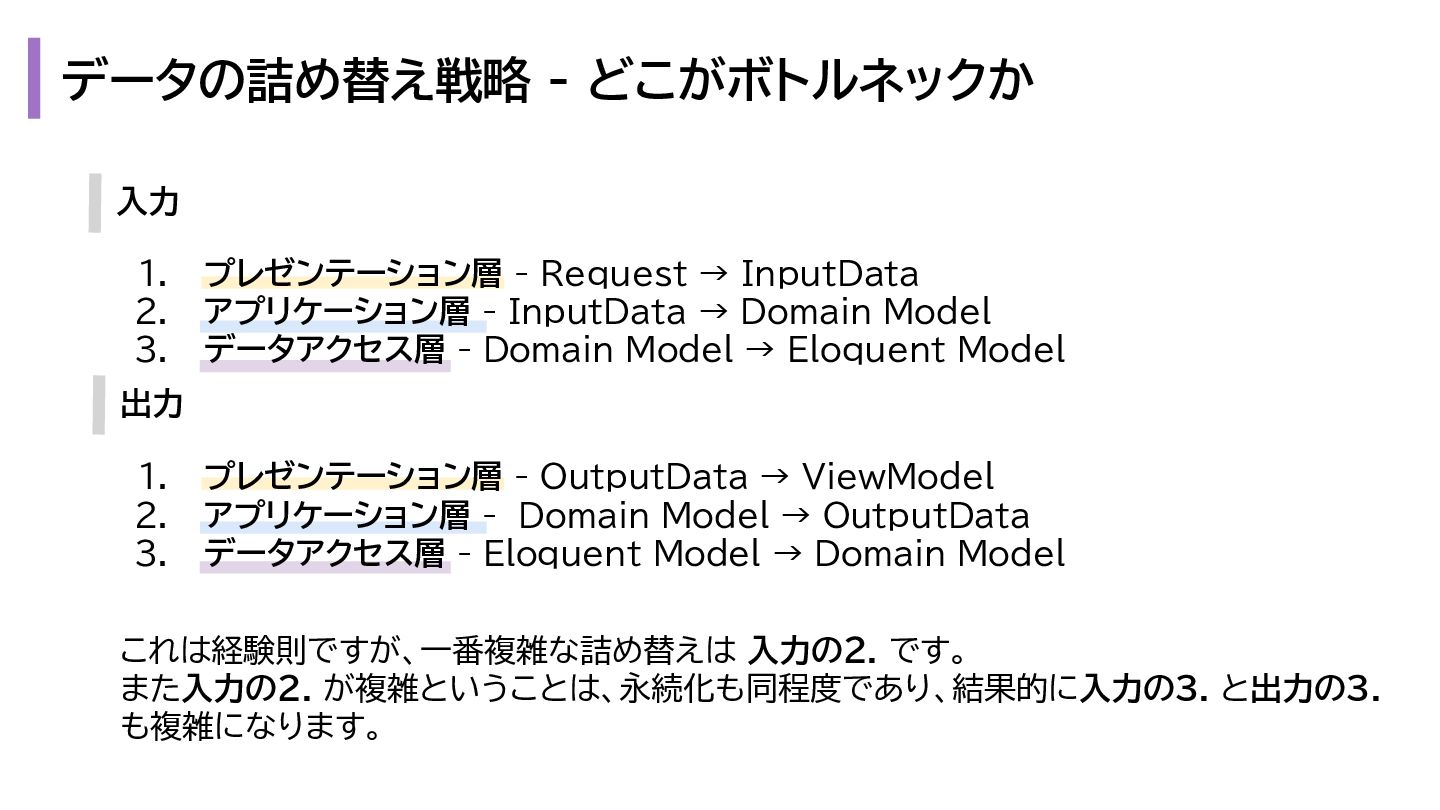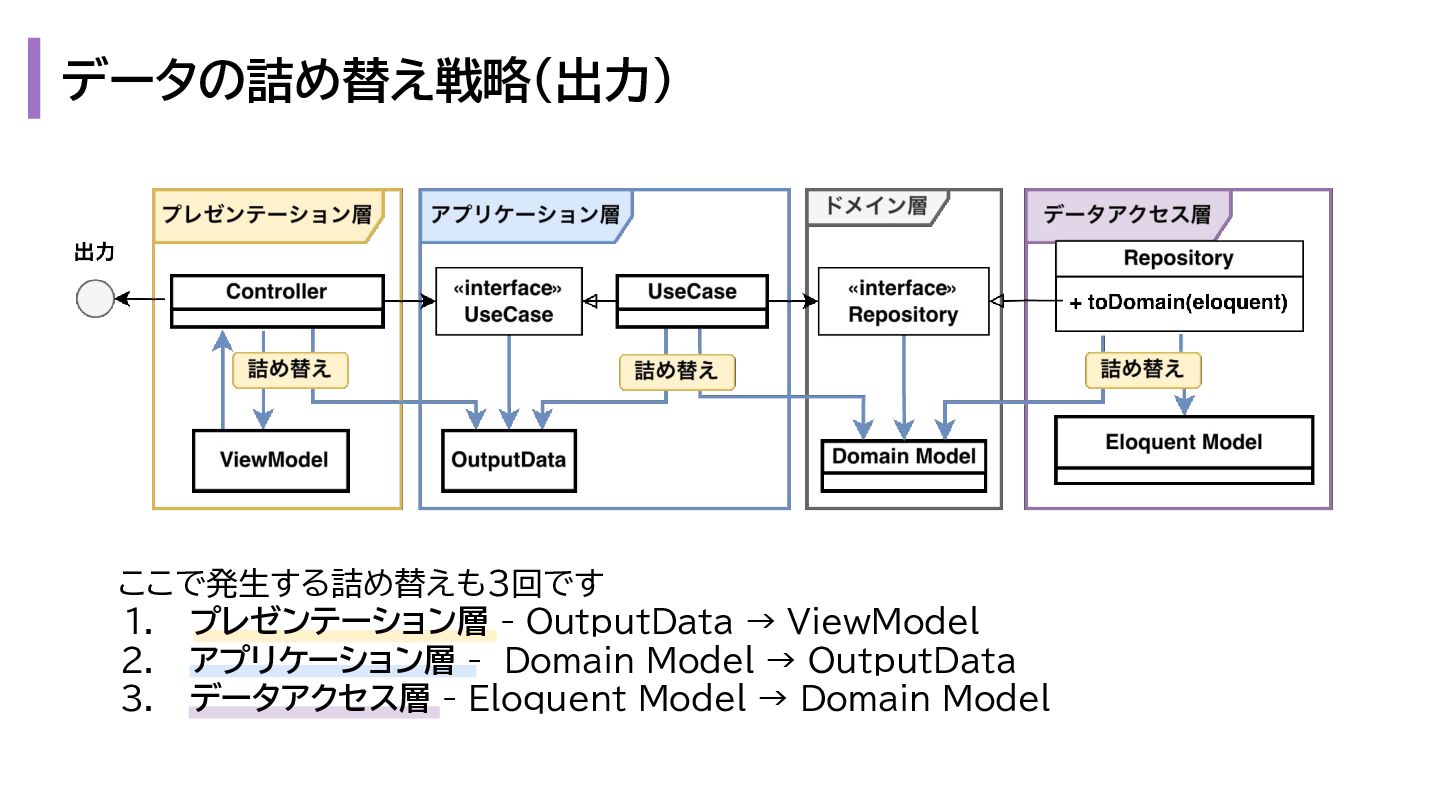 と出力の3. も複雑になります。 1. プレゼンテーション層 - Request → InputData 2. アプリケーション層 - InputData → Domain Model 3. データアクセス層 - Domain Model → Eloquent Model 1. プレゼンテーション層 - OutputData → ViewModel 2. アプリケーション層 - Domain Model → OutputData 3. データアクセス層 - Eloquent Model → Domain Model