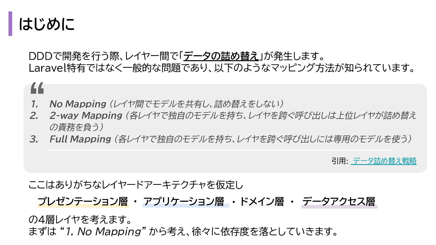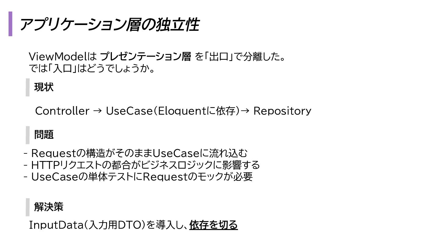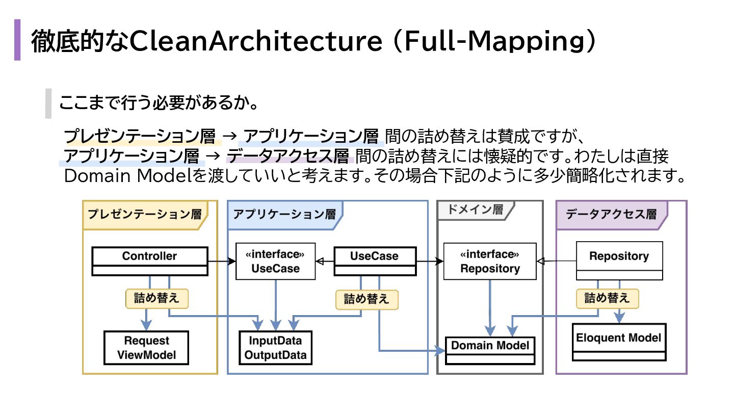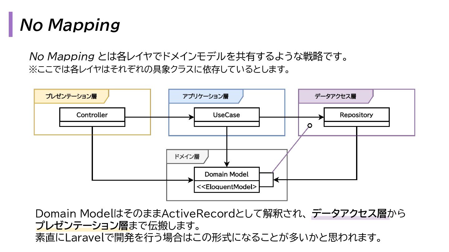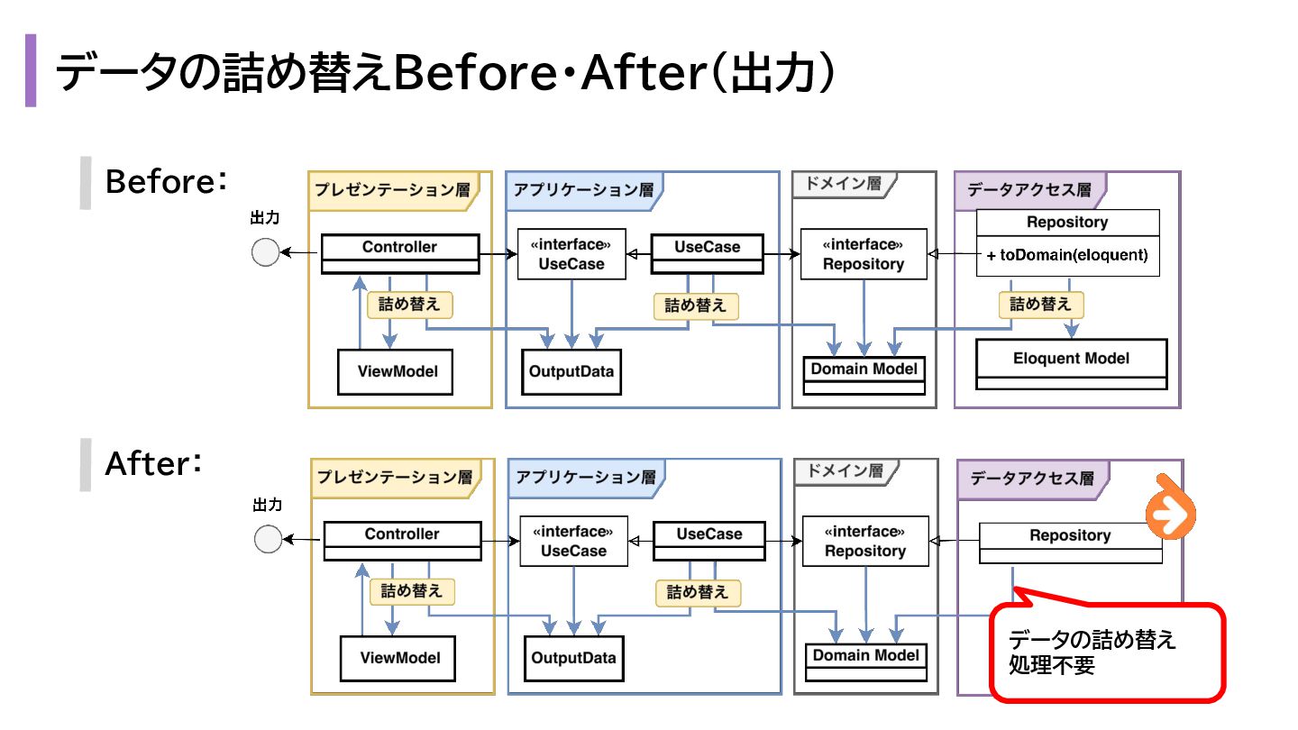と出力の3. も複雑になります。 1. プレゼンテーション層 - Request → InputData 2. アプリケーション層 - InputData → Domain Model 3. データアクセス層 - Domain Model → Eloquent Model 1. プレゼンテーション層 - OutputData → ViewModel 2. アプリケーション層 - Domain Model → OutputData 3. データアクセス層 - Eloquent Model → Domain Model