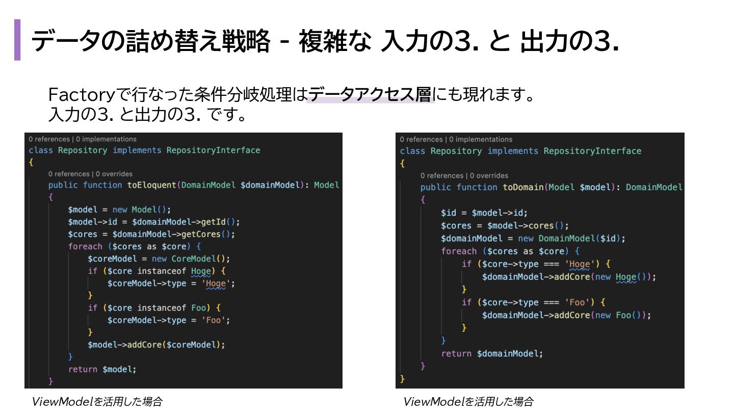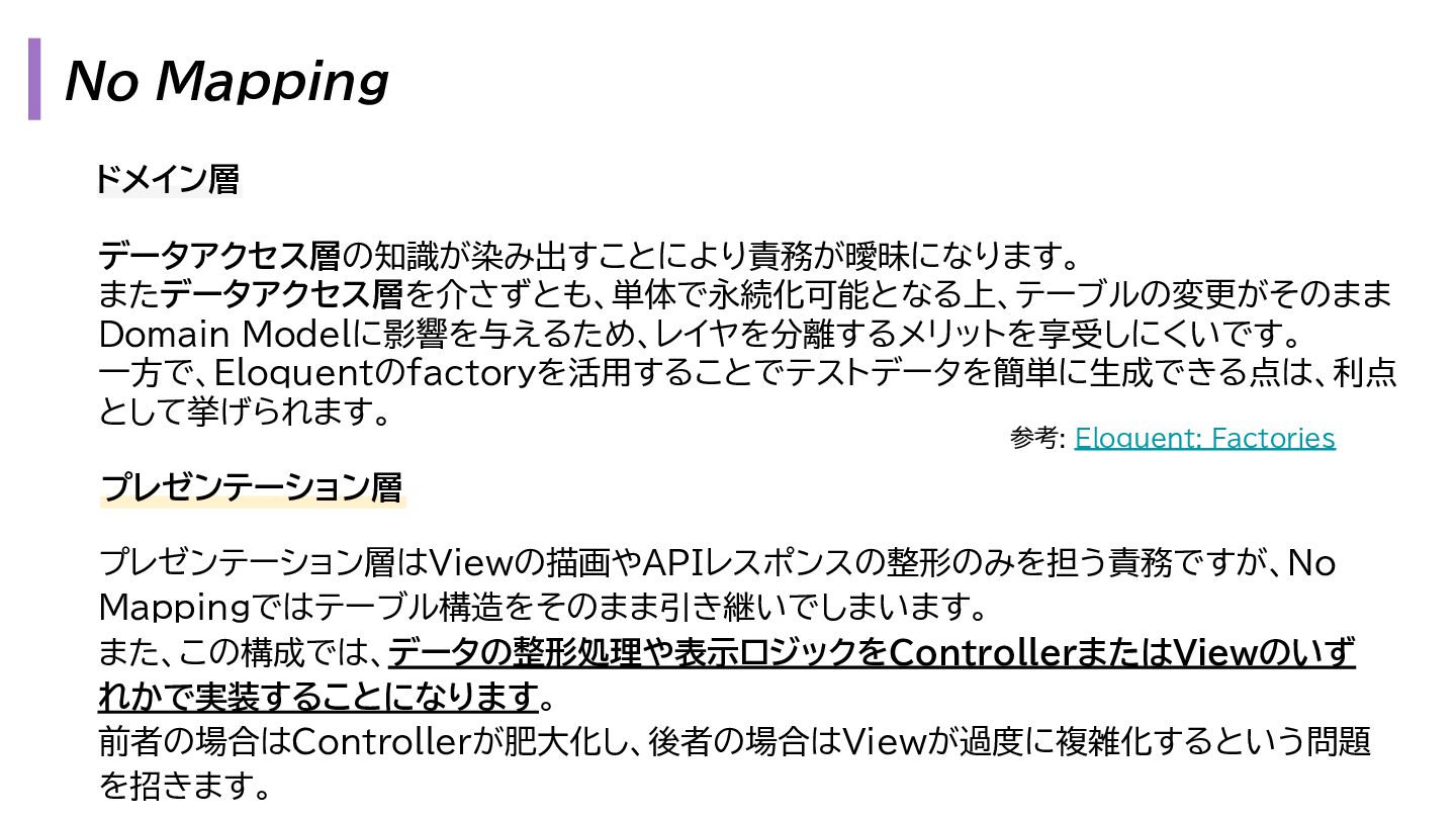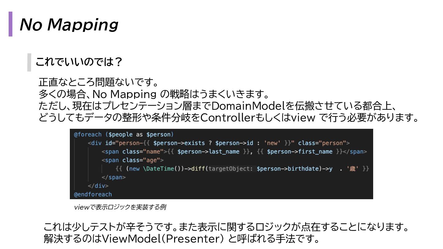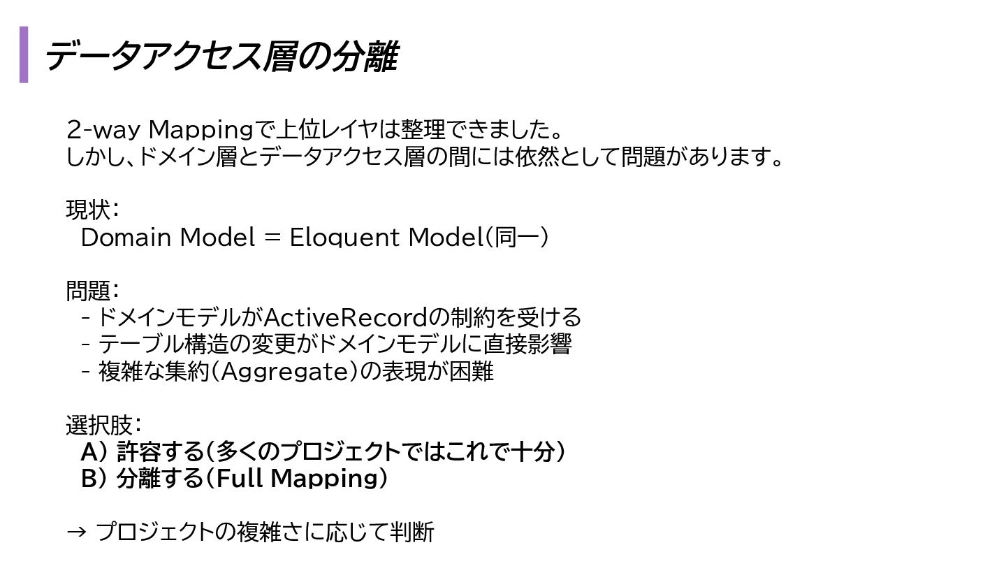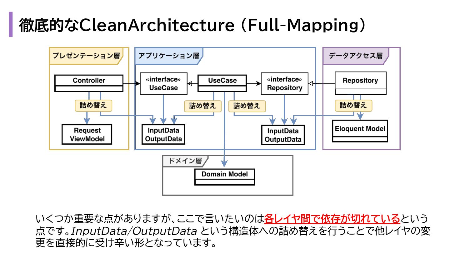 と出力の3. も複雑になります。 1. プレゼンテーション層 - Request → InputData 2. アプリケーション層 - InputData → Domain Model 3. データアクセス層 - Domain Model → Eloquent Model 1. プレゼンテーション層 - OutputData → ViewModel 2. アプリケーション層 - Domain Model → OutputData 3. データアクセス層 - Eloquent Model → Domain Model
