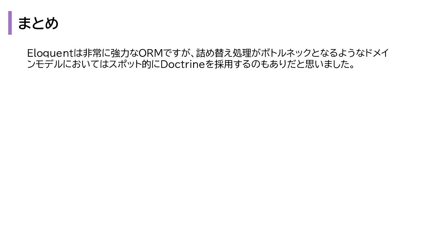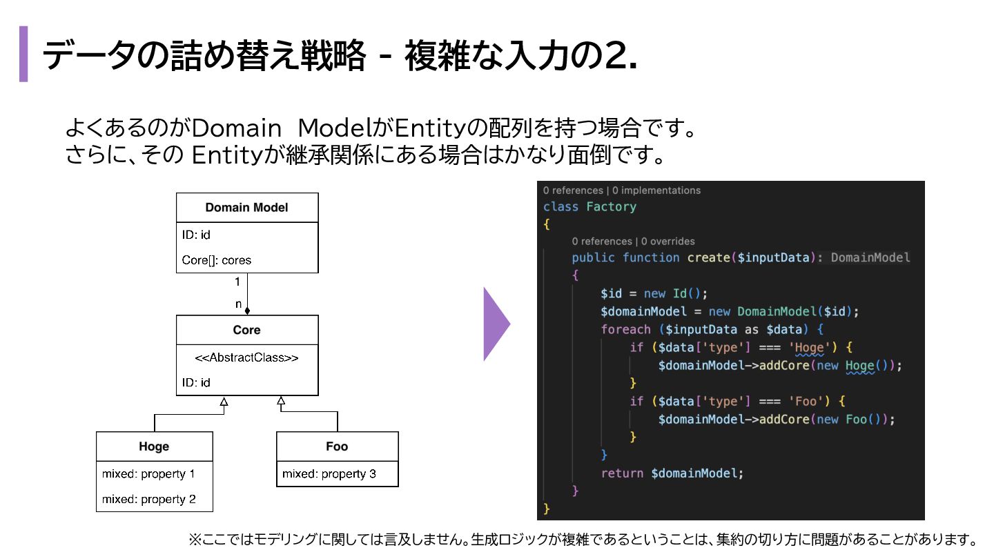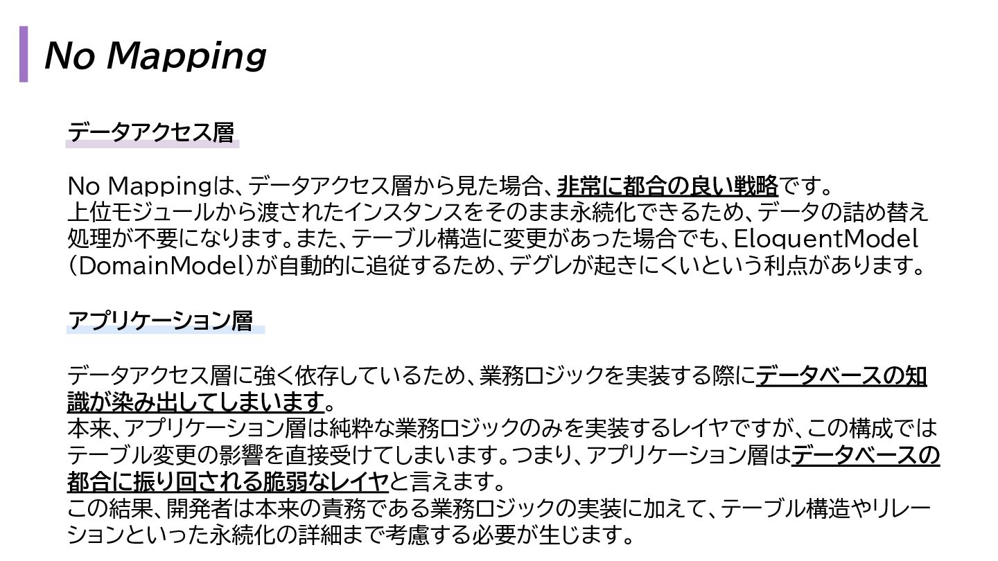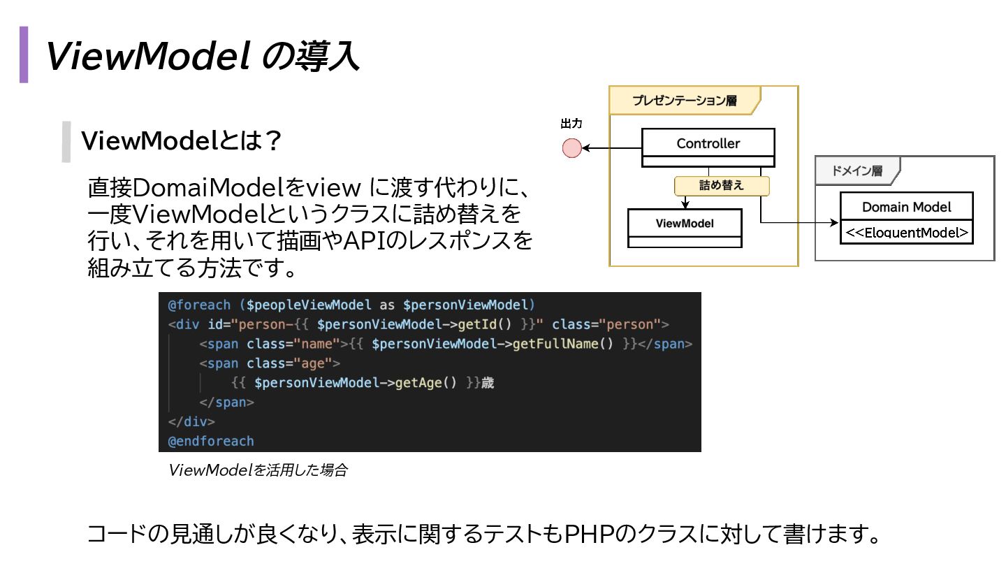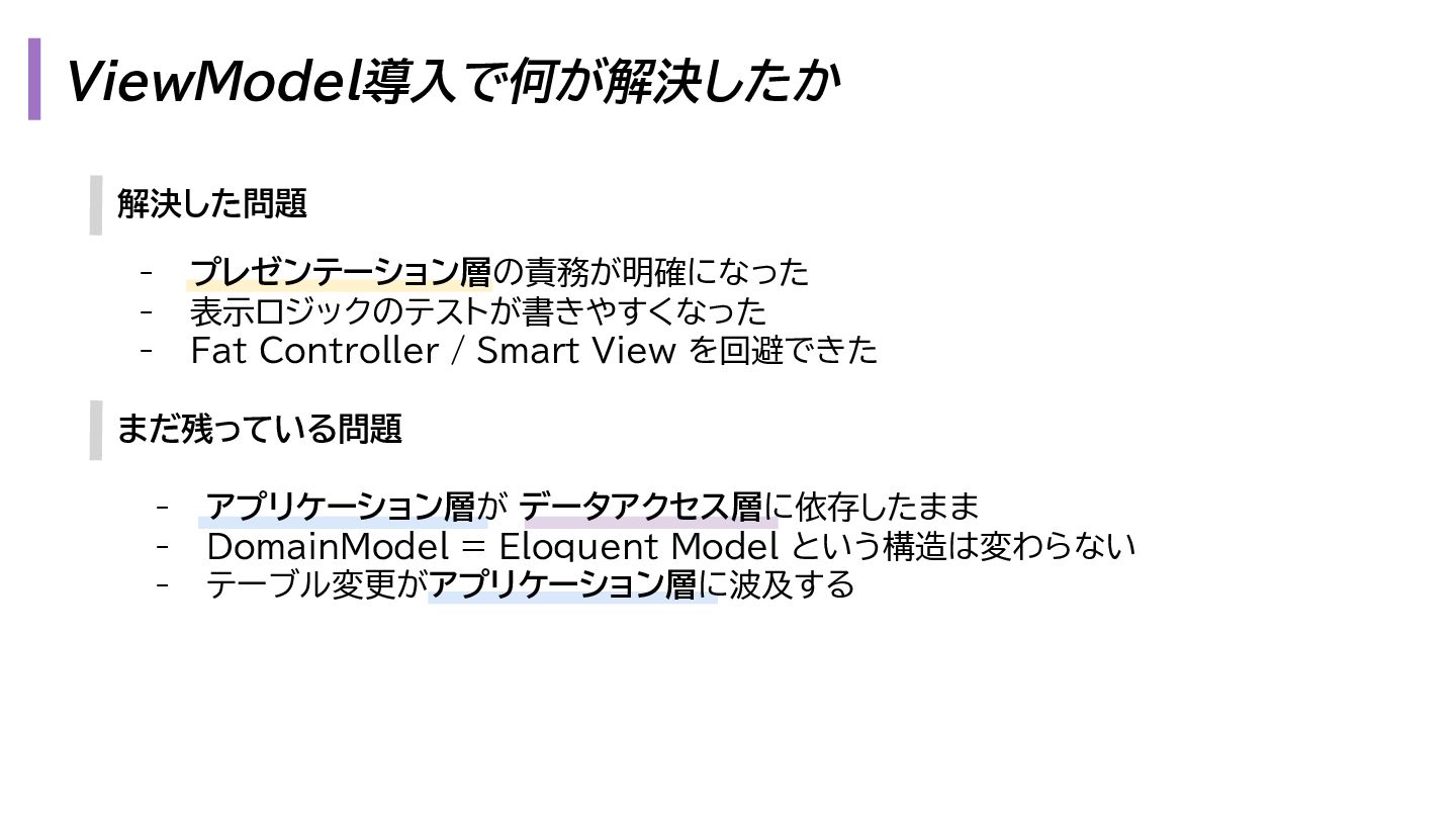 と出力の3. も複雑になります。 1. プレゼンテーション層 - Request → InputData 2. アプリケーション層 - InputData → Domain Model 3. データアクセス層 - Domain Model → Eloquent Model 1. プレゼンテーション層 - OutputData → ViewModel 2. アプリケーション層 - Domain Model → OutputData 3. データアクセス層 - Eloquent Model → Domain Model
