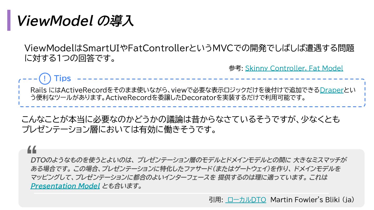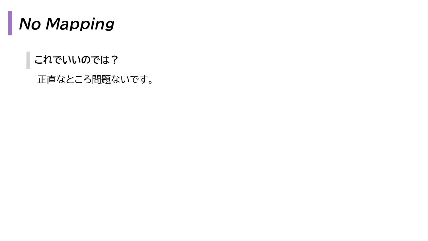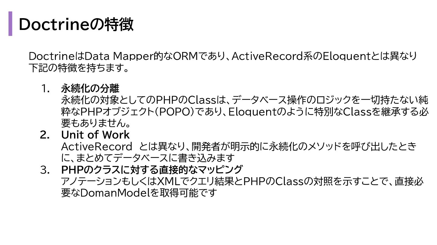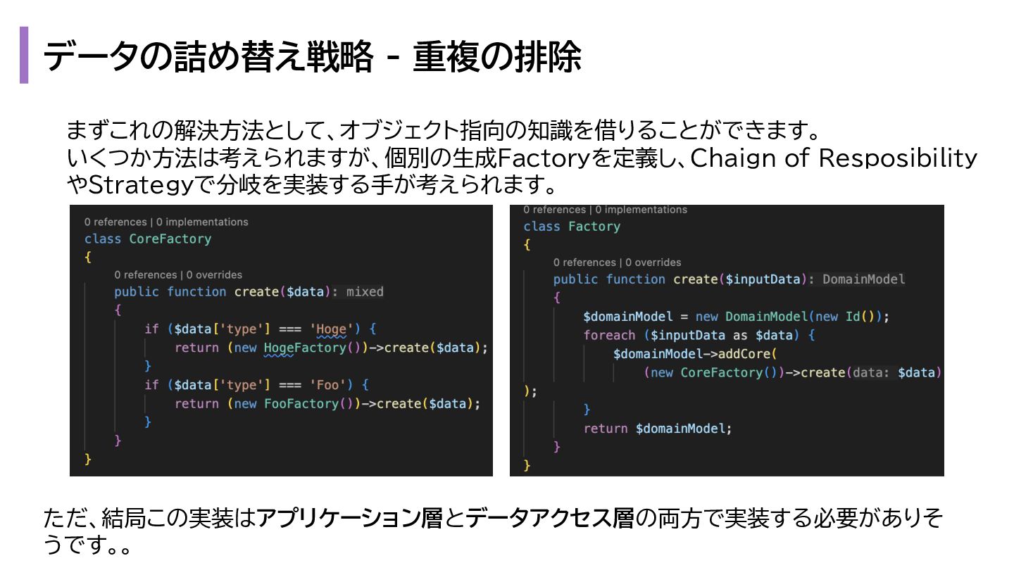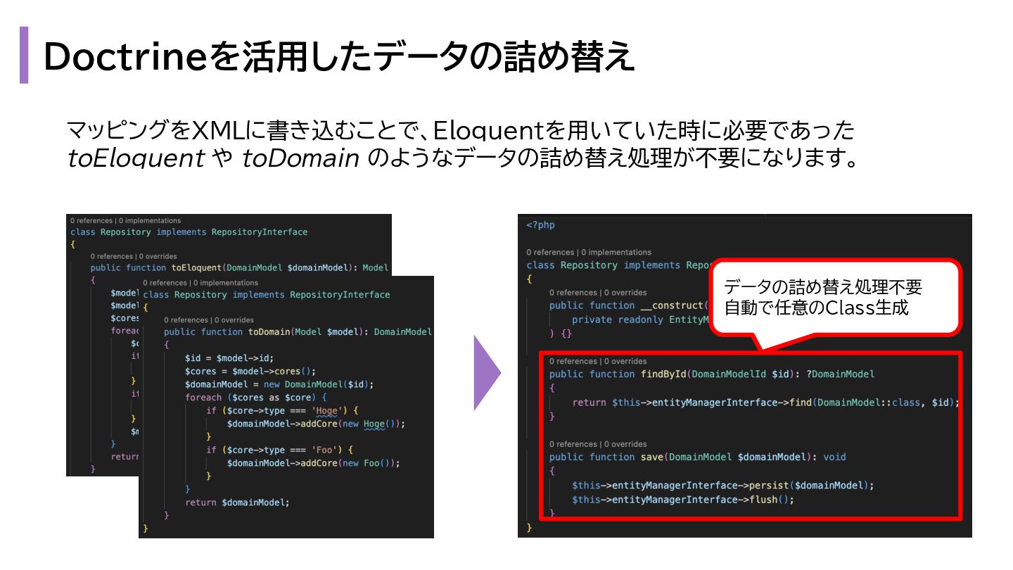 と出力の3. も複雑になります。 1. プレゼンテーション層 - Request → InputData 2. アプリケーション層 - InputData → Domain Model 3. データアクセス層 - Domain Model → Eloquent Model 1. プレゼンテーション層 - OutputData → ViewModel 2. アプリケーション層 - Domain Model → OutputData 3. データアクセス層 - Eloquent Model → Domain Model