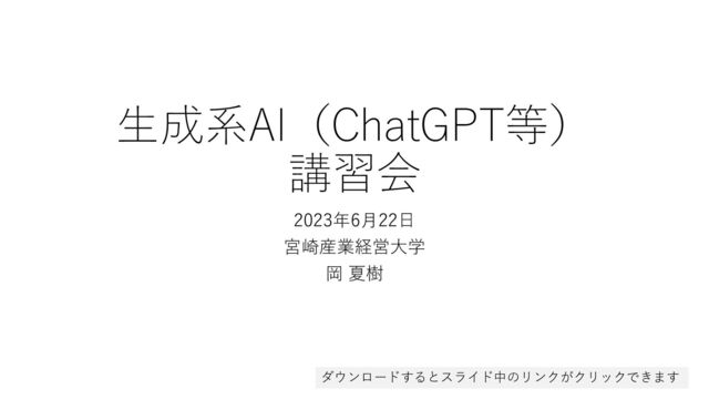 生成系AI(ChatGPT等)の仕組み 生成系AI(ChatGPT等)を使う上での注意点 教育場面での生成系AI(ChatGPT等)の使用例:教員側/学生側 質疑応答 生成系AI(ChatGPT等)の試用(実習形式) 関連情報へのリンク