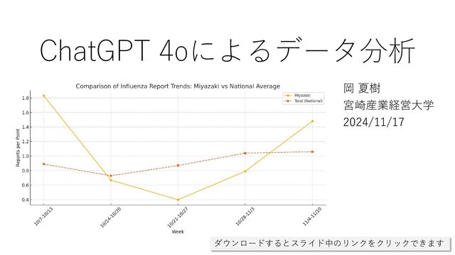 データ分析のしかた(いろいろあります) - (昔ながらの)エクセルやRを使って自力で分析 - Pythonのプログラムを自分で書いて分析 - 生成AIにPythonプログラムを書かせて分析 - 生成AIにデータ分析を(言葉で)頼む ← このスライドはこの方法を具体例(インフルエンザの定点当たり報告数推移データの分析)で解説します