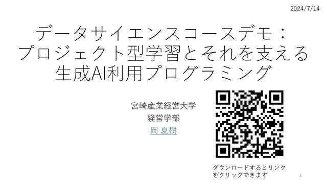 宮崎産業経営大学オープンキャンパス(2024/7/14)におけるデータサイエンスコースのデモ内容を説明するスライドです。プロジェクト型学習のテーマ例(ダンスステップチュータと就活支援対話ロボット)を説明し、続いて、それを支える生成AI利用プログラミングについてプログラミングの様子を交えて解説します。