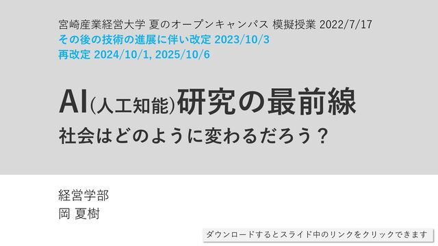 1. 適切な(知的な)応答について考えてみよう:古くから使われている基本技術を例として 2. AI研究の最前線:深層学習からChatGPTまで 3. 社会はどのように変わるか ・AIが人を超えてもあまり変わらないのは… ・影響があるのは…