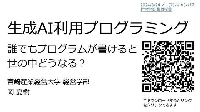 1. 生成AI利用プログラミングを体験しよう - ビンゴのプログラムを作ろう - ダンスステップチュータ デモ ← 協力:ダンス部 - ビデオゲームのNPCを作ろう 2. 世の中どう変わる? - 思いついたら誰でも動くものが作れる(データサイエンスコースで少し勉強すれば) - あなたが、世の中の課題に気付いたり、まだ見ぬ世界を想像できるか、問を立てられるかが鍵(今のところは) - 近い将来、もっと大きく変わる