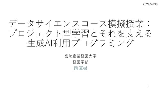 データサイエンスコースの模擬授業として、2つのプロジェクト型学習(PBL)とそれを支える生成AI利用プログラミング教育を紹介する。PBLの1つ目は、MediaPipeのポーズランドマーク検出を利用したダンスステップチュータ;2つ目は、RAG機能を備えた就活支援対話ロボットである。生成AI利用プログラミングは、Colab AIやGitHub Copilotを活用する方法を演習形式で学び、誰でもプログラミングできる時代に活躍できる人材を育成する。
