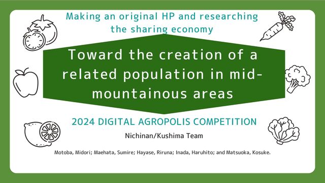 DIGITAL AGROPOLIS COMPETITION Nichinan/Kushima Team Motoba, Midori; Maehata, Sumire; Hayase, Riruna; Inada, Haruhito; and Matsuoka, Kosuke. Toward the creation of a related population in mid- mountainous areas