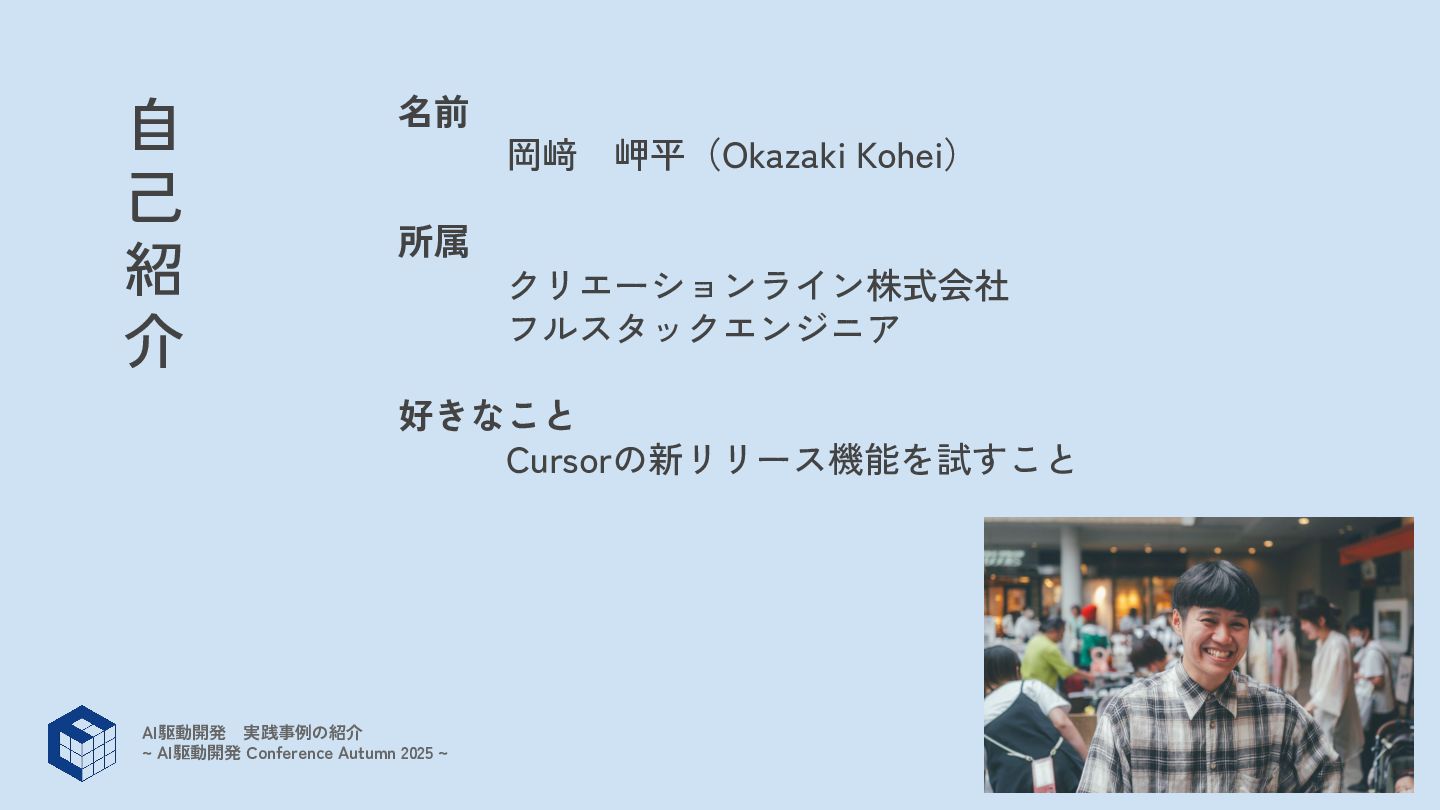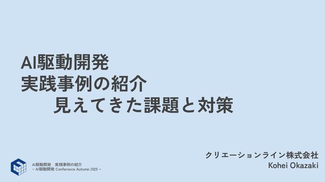 AI駆動開発 実践事例の紹介 見えてきた課題と対策 クリエーションライン株式会社 Kohei Okazaki AI駆動開発 実践事例の紹介 ~ AI駆動開発 Conference