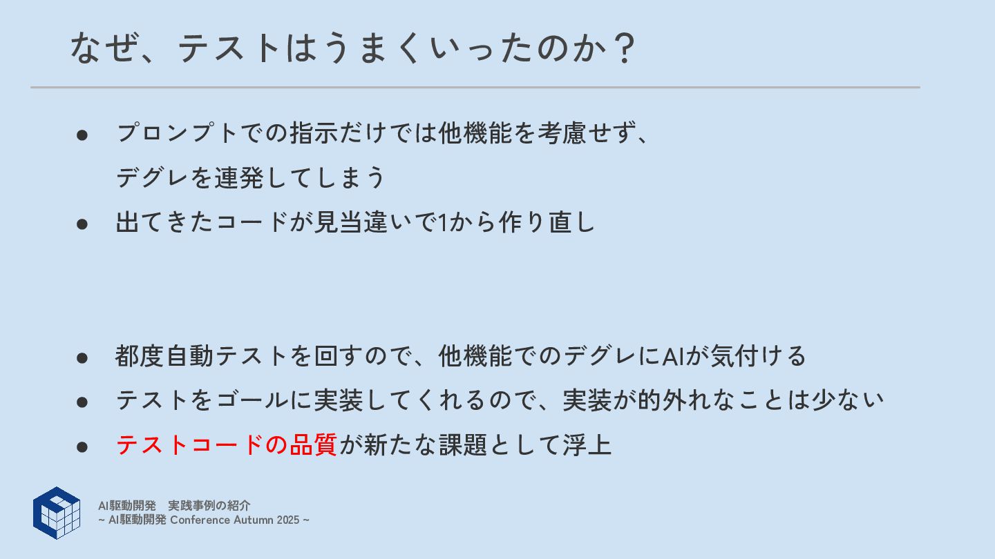 テストコードの品質が新たな課題として浮上 AI駆動開発 実践事例の紹介 ~ AI駆動開発 Conference Autumn 2025 ~ なぜ、テストはうまくいったのか?