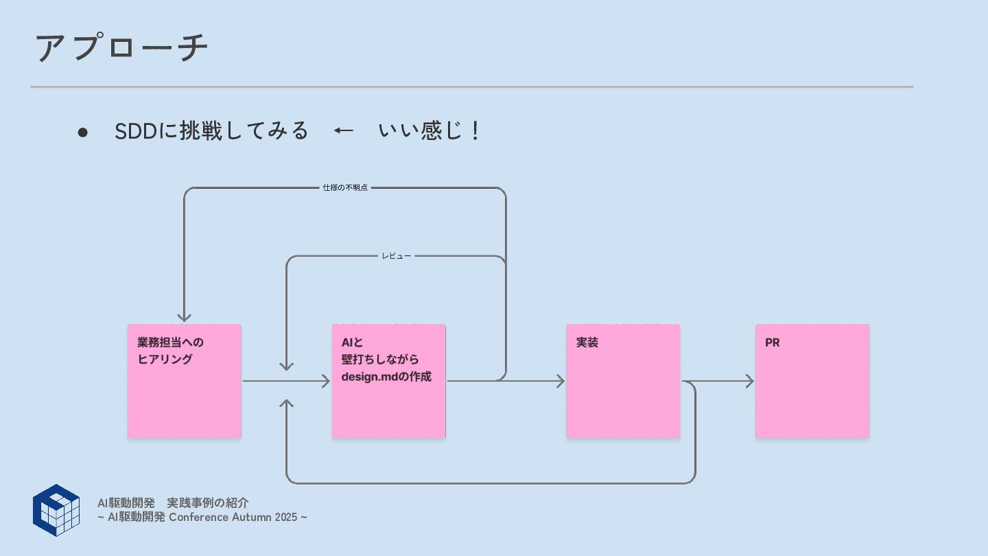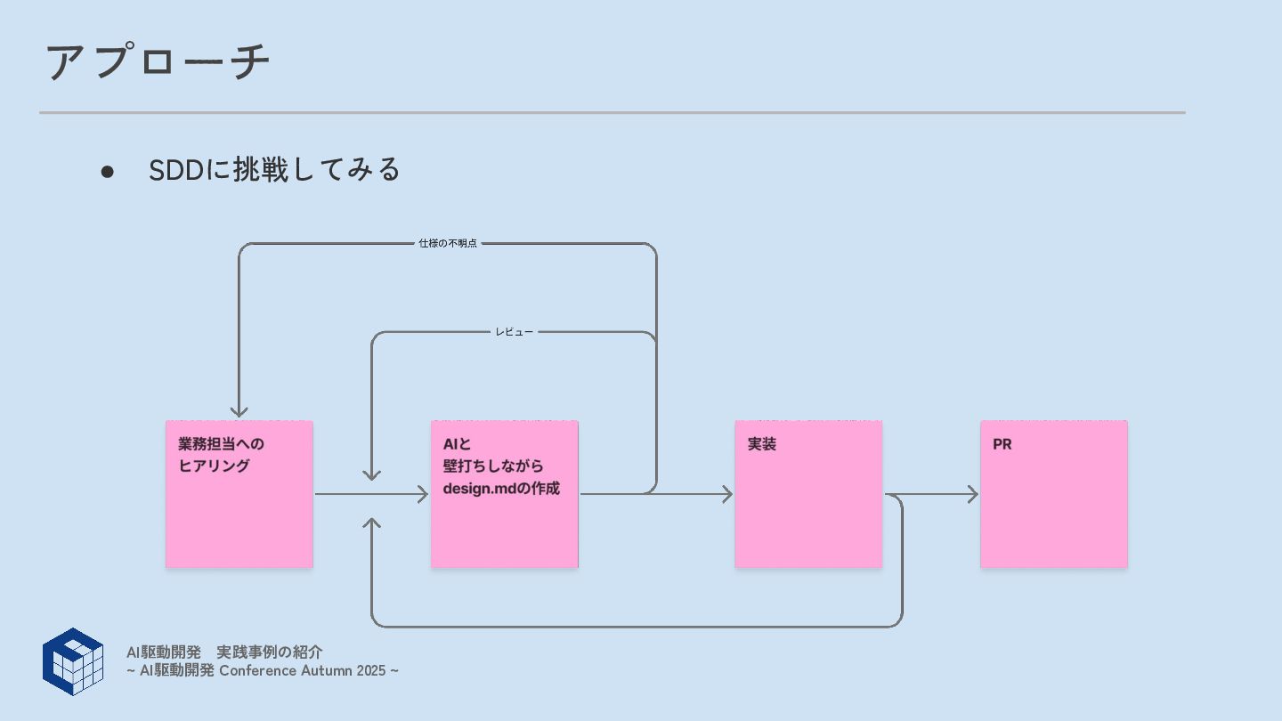 • SDDに挑戦してみる ← いい感じ! AI駆動開発 実践事例の紹介 ~ AI駆動開発 Conference Autumn 2025 ~ アプローチ