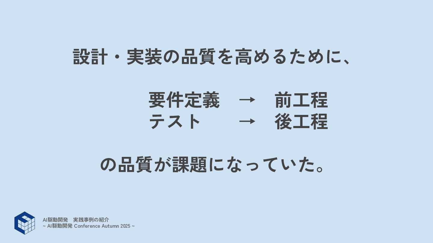 設計・実装の品質を高めるために、 要件定義 → 前工程 テスト → 後工程 の品質が課題になっていた。 AI駆動開発 実践事例の紹介 ~ AI駆動開発 Conference Autumn 2025