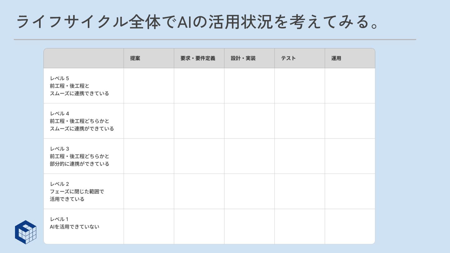 AI駆動開発 実践事例の紹介 ~ AI駆動開発 Conference Autumn 2025 ~ ライフサイクル全体でAIの活用状況を考えてみる。 隣接する領域の AI活用レベルの影響を受けやすい。
