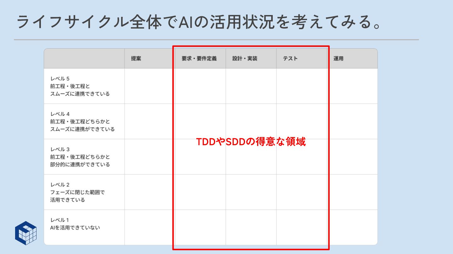 AI駆動開発 実践事例の紹介 ~ AI駆動開発 Conference Autumn 2025 ~ ライフサイクル全体でAIの活用状況を考えてみる。 TDDやSDDの得意な領域