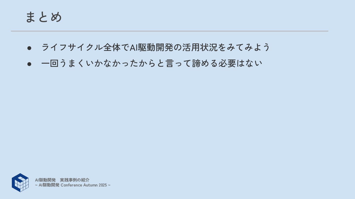 • ライフサイクル全体でAI駆動開発の活用状況をみてみよう • 一回うまくいかなかったからと言って諦める必要はない AI駆動開発 実践事例の紹介 ~ AI駆動開発 Conference Autumn 2025