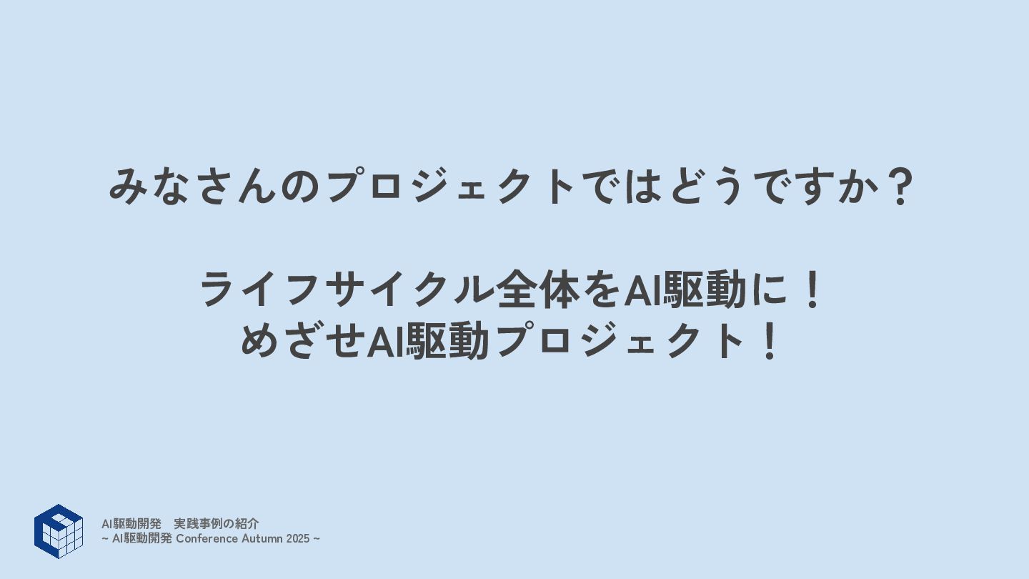 AI駆動開発 実践事例の紹介 ~ AI駆動開発 Conference Autumn 2025 ~ みなさんのプロジェクトではどうですか? ライフサイクル全体をAI駆動に! めざせAI駆動プロジェクト!