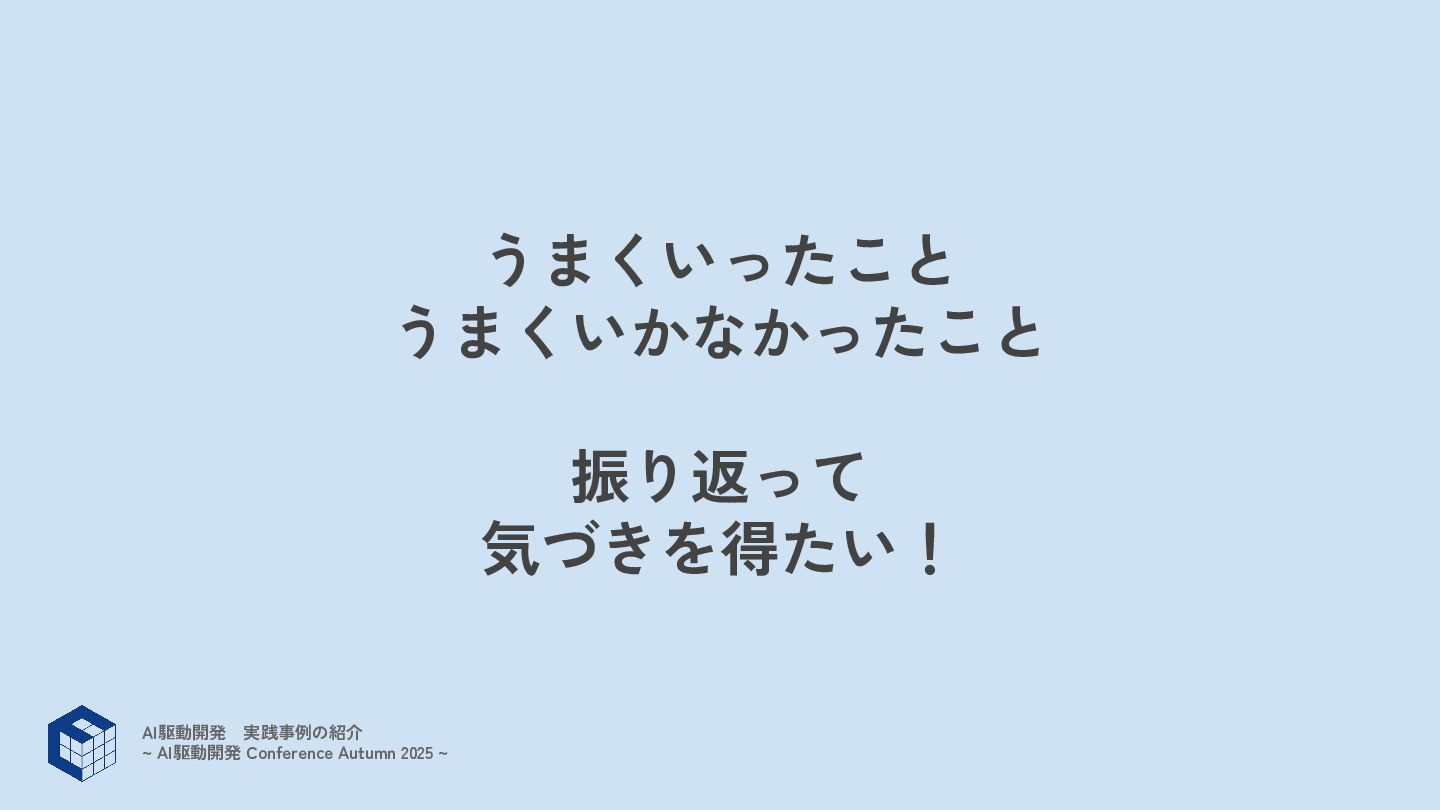 うまくいったこと うまくいかなかったこと 振り返って 気づきを得たい! AI駆動開発 実践事例の紹介 ~ AI駆動開発 Conference Autumn 2025