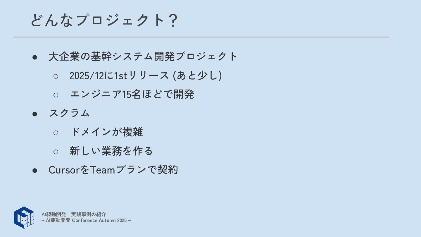AI駆動開発 実践事例の紹介 ~ AI駆動開発 Conference Autumn 2025 ~ • 大企業の基幹システム開発プロジェクト ◦