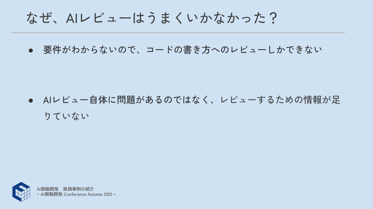 • 要件がわからないので、コードの書き方へのレビューしかできない • AIレビュー自体に問題があるのではなく、レビューするための情報が足 りていない AI駆動開発 実践事例の紹介 ~ AI駆動開発 Conference Autumn