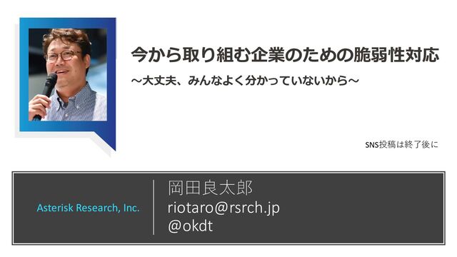 本講演は、米国大統領令で示された「SBOM」など、この「脆弱性」対応にまつわる情勢に注意を向けつつ、実際の取り組みに役立つ視点と実践に移すことのできるプラクティスを紹介します。