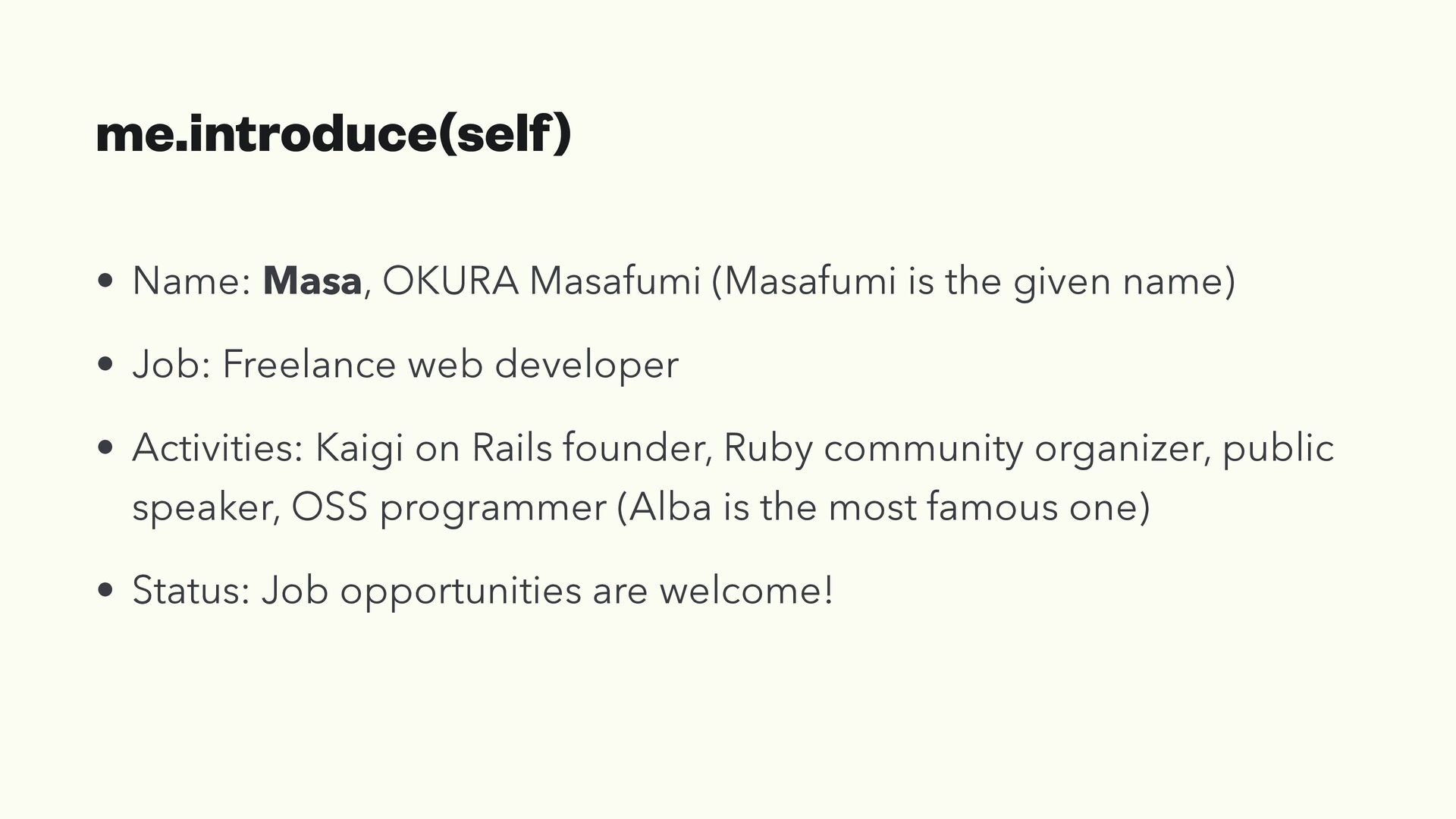 name) • Job: Freelance web developer • Activities: Kaigi on Rails founder, Ruby community organizer, public speaker, OSS programmer (Alba is the most famous one) • Status: Job opportunities are welcome!