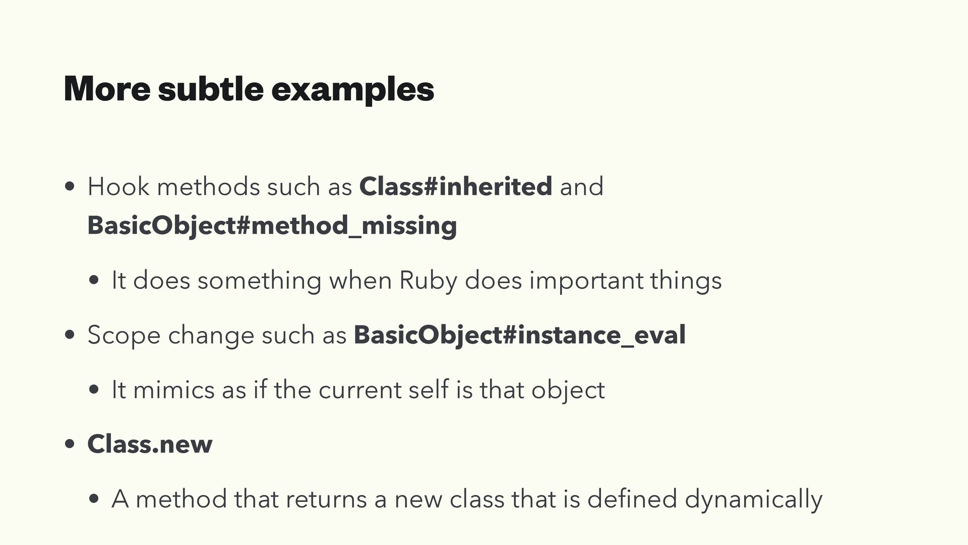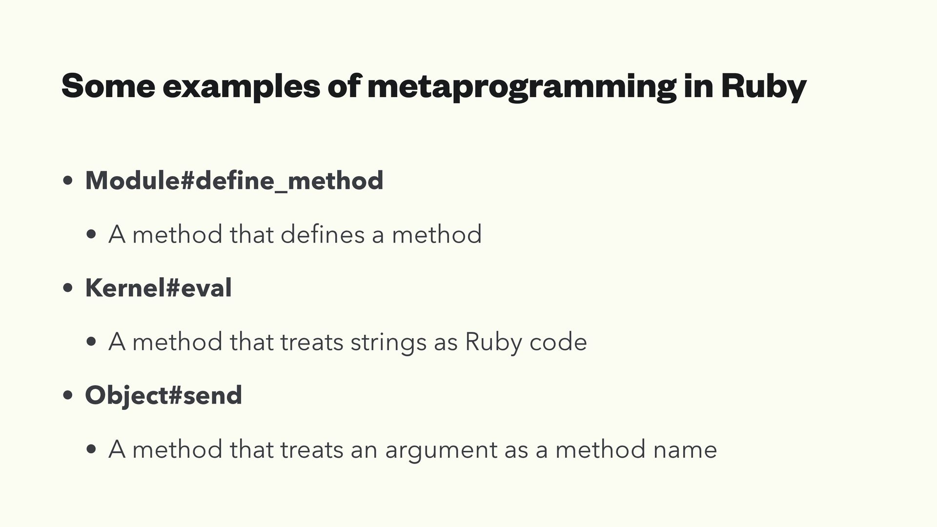 • A method that de fi nes a method • Kernel#eval • A method that treats strings as Ruby code • Object#send • A method that treats an argument as a method name