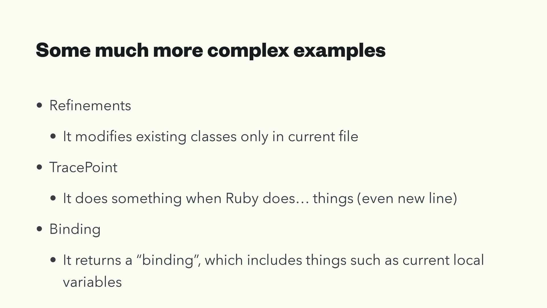 It modi fi es existing classes only in current fi le • TracePoint • It does something when Ruby does… things (even new line) • Binding • It returns a “binding”, which includes things such as current local variables