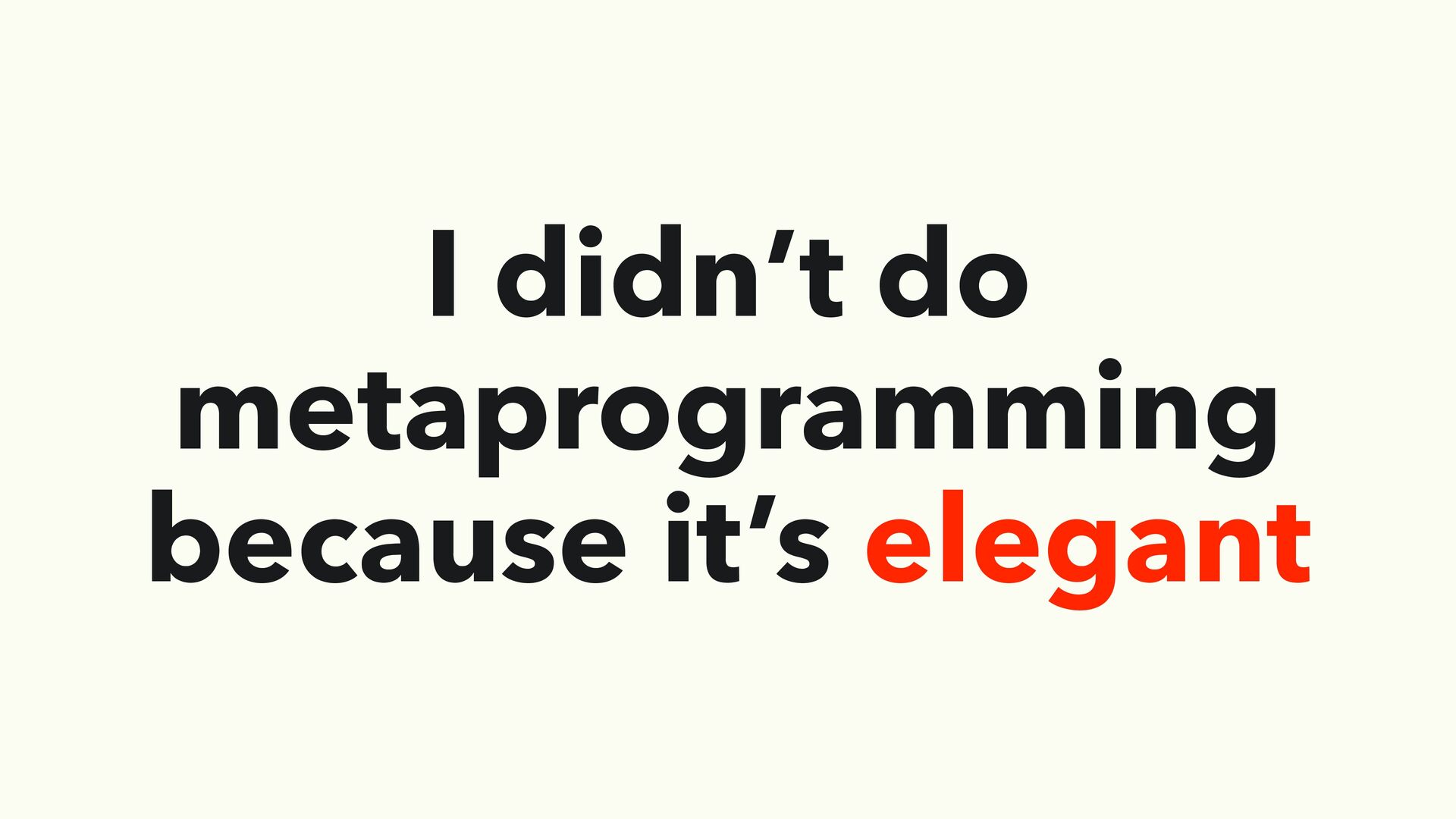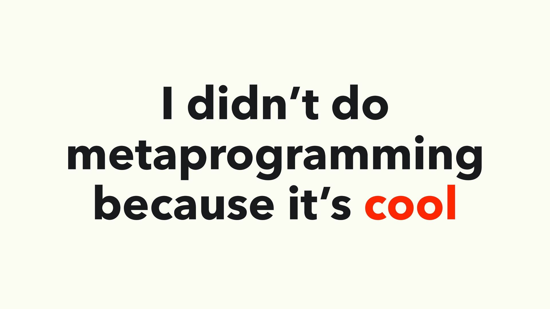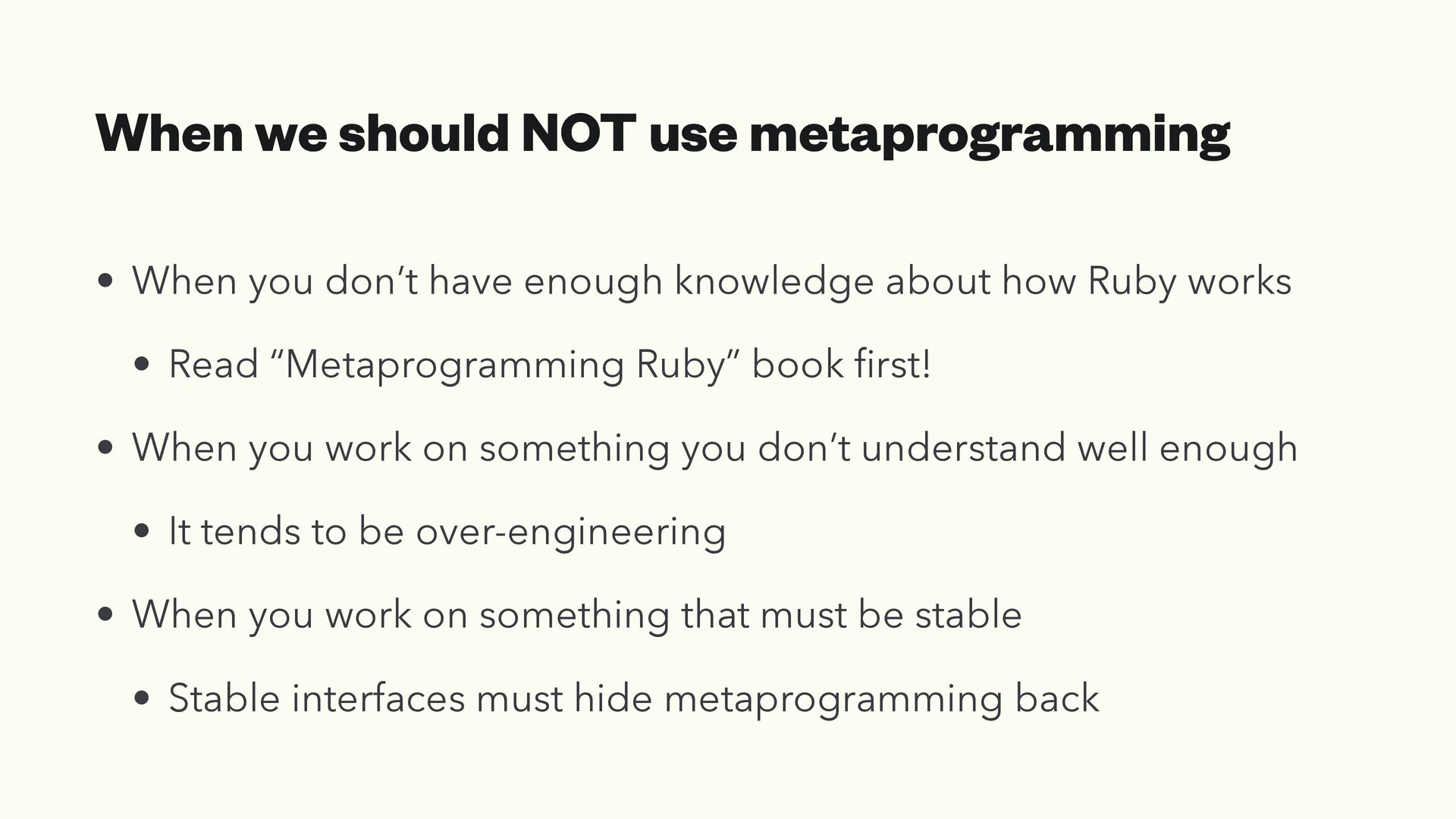 have enough knowledge about how Ruby works • Read “Metaprogramming Ruby” book fi rst! • When you work on something you don’t understand well enough • It tends to be over-engineering • When you work on something that must be stable • Stable interfaces must hide metaprogramming back