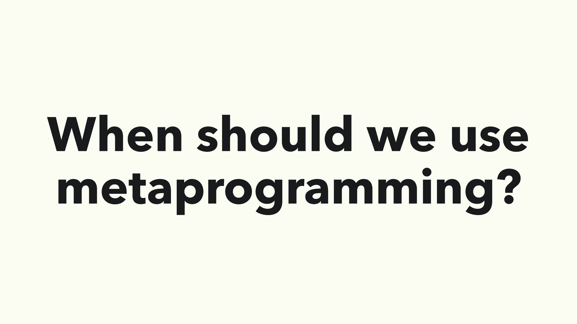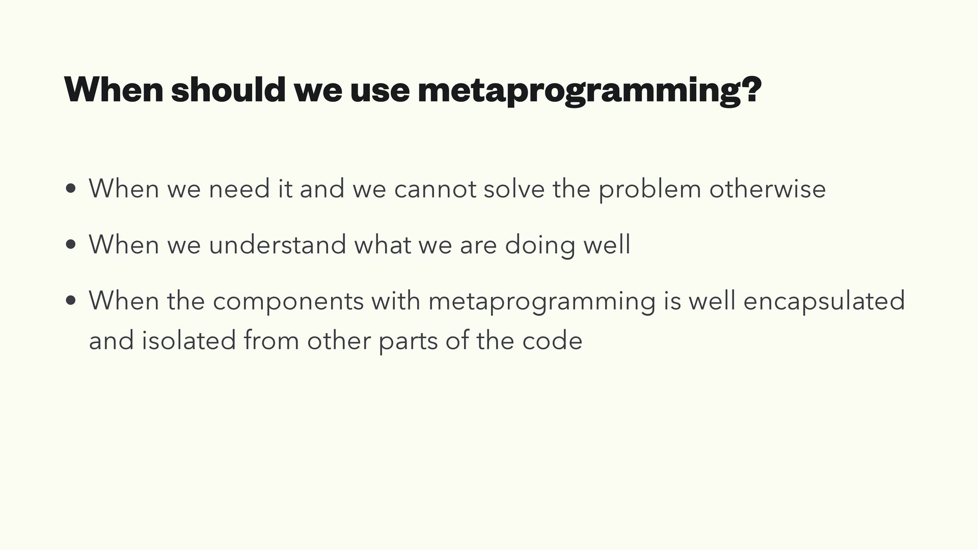 and we cannot solve the problem otherwise • When we understand what we are doing well • When the components with metaprogramming is well encapsulated and isolated from other parts of the code