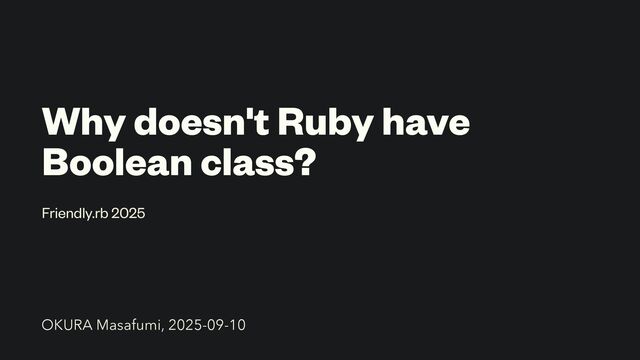 introduced Boolean class. I don't want to break them. true and false are the only representative of true- false values. In Ruby. nil and false are falsy values, and everything else is a true value. There's no meaning for having a superclass of TrueClass and FalseClass as Boolean. Matz. ʢUnderscored by the speakerʣ