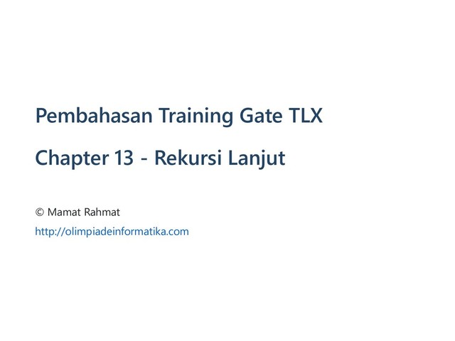 grid mulai dari suatu titik menyebar ke kiri,kanan,atas,bawah yang bilangannya sama ﴾gunakan rekursi﴿ Algoritma ini disebut floodfill Kita harus menandai titik mana saja yang sudah dikunjungi agar tidak dikunjungi lagi ﴾infinite recursion﴿ rec(a, b) { if (a>=1 and a<=n and b>=1 and b<=m) if (not visited[a][b] and grid[a][b]=grid[x][y]) visited[a][b] = true; tot++; rec(a+1,b); rec(a‐1,b); rec(a,b+1); rec(a,b‐1); } rec(x, y)