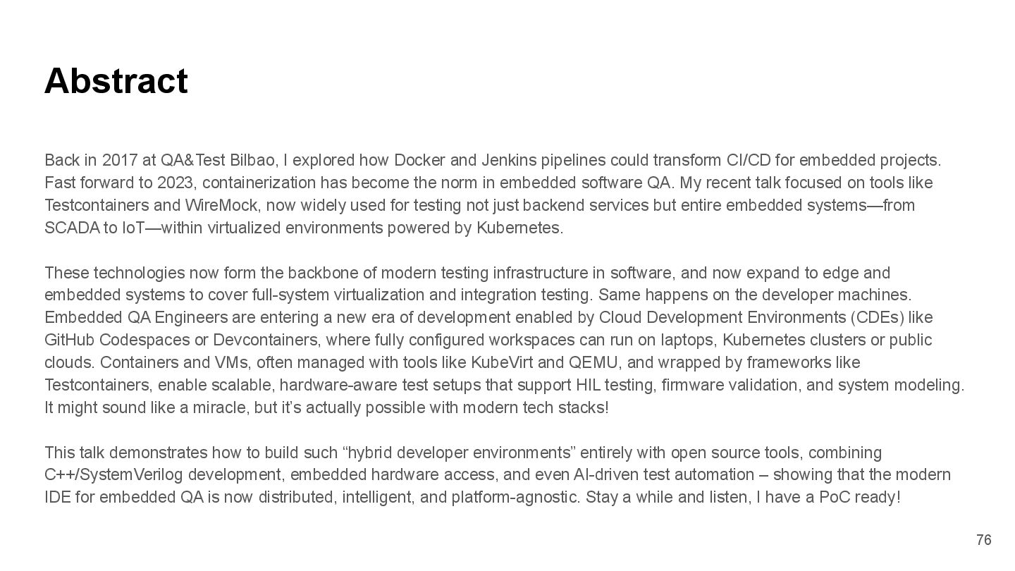 Back in 2017 at QA&Test Bilbao, I explored how Docker and Jenkins pipelines could transform CI/CD for embedded projects. Fast forward to 2023, containerization has become the norm in embedded software QA. My recent talk focused on tools like Testcontainers and WireMock, now widely used for testing not just backend services but entire embedded systems—from SCADA to IoT—within virtualized environments powered by Kubernetes. These technologies now form the backbone of modern testing infrastructure in software, and now expand to edge and embedded systems to cover full-system virtualization and integration testing. Same happens on the developer machines.