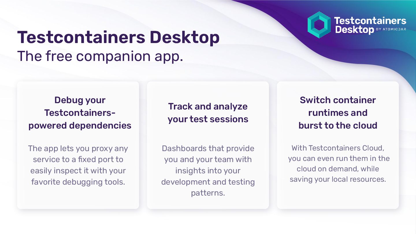 any service to a fixed port to easily inspect it with your favorite debugging tools. Track and analyze your test sessions Dashboards that provide you and your team with insights into your development and testing patterns. Switch container runtimes and burst to the cloud With Testcontainers Cloud, you can even run them in the cloud on demand, while saving your local resources. Testcontainers Desktop The free companion app.
