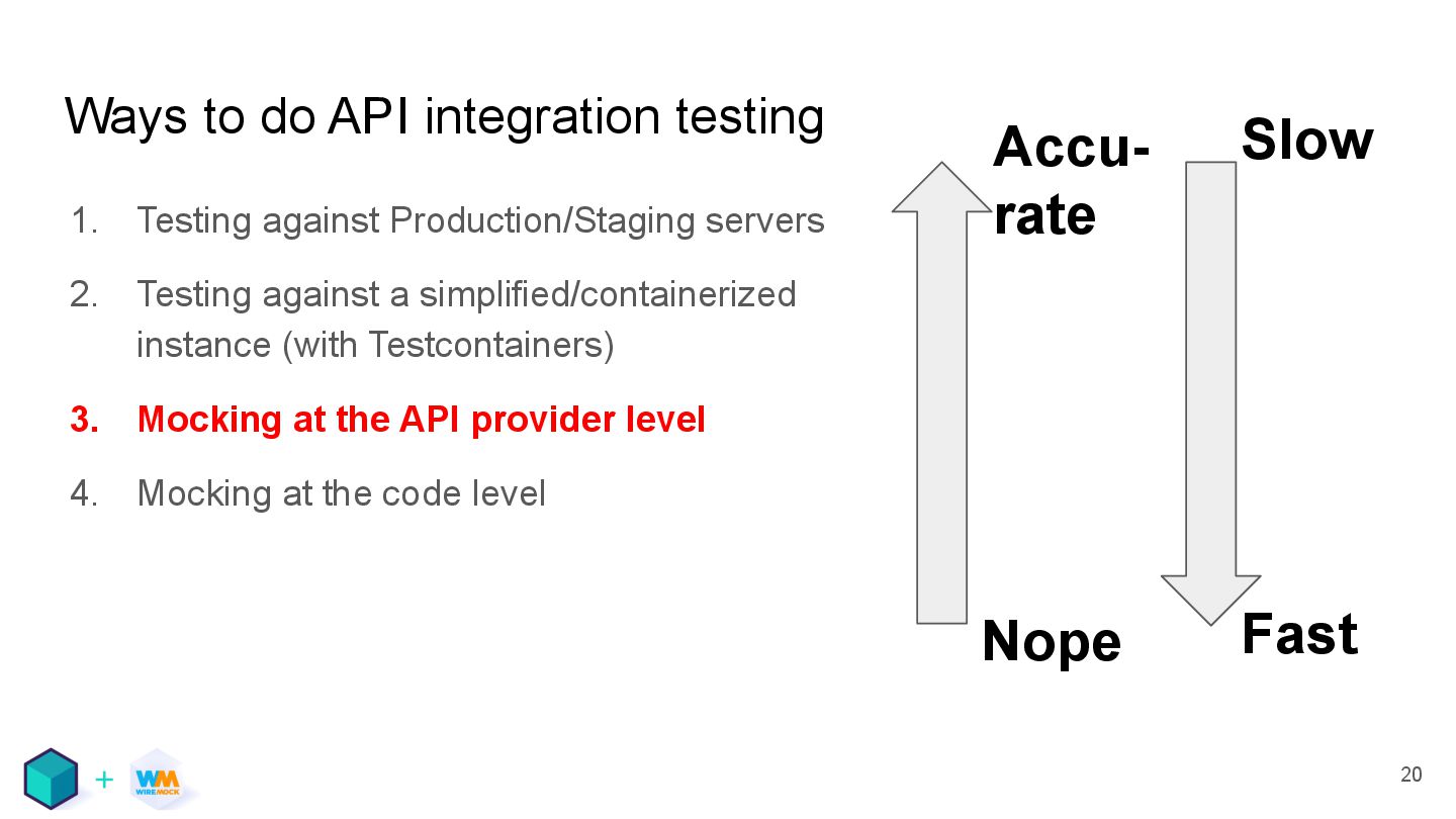 servers 2. Testing against a simplified/containerized instance (with Testcontainers) 3. Mocking at the API provider level 4. Mocking at the code level 20 Slow Fast Accu- rate Nope