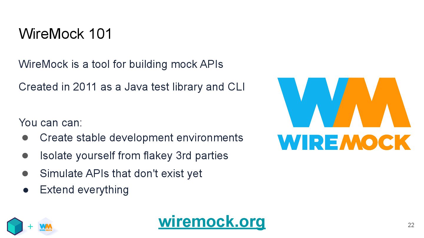APIs Created in 2011 as a Java test library and CLI You can can: • Create stable development environments • Isolate yourself from flakey 3rd parties • Simulate APIs that don't exist yet • Extend everything wiremock.org