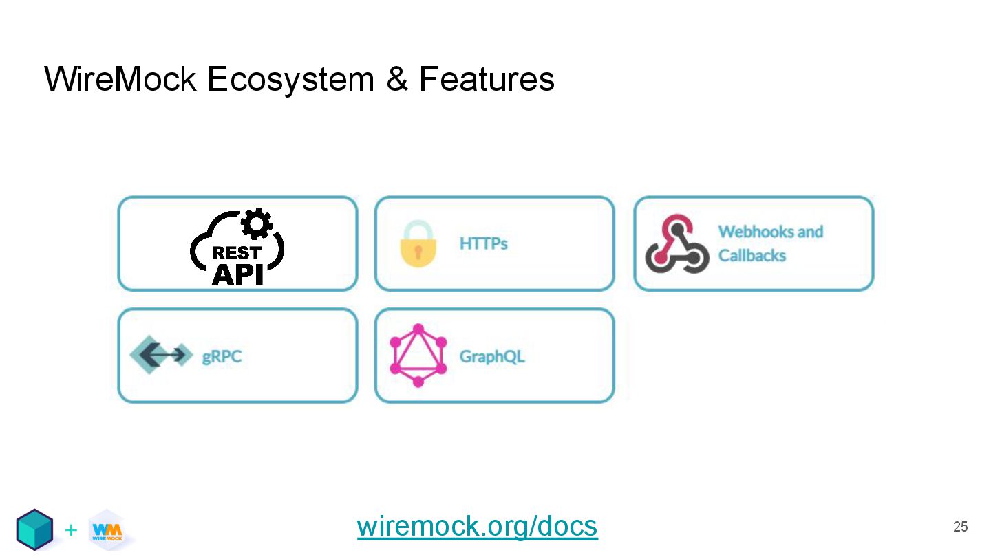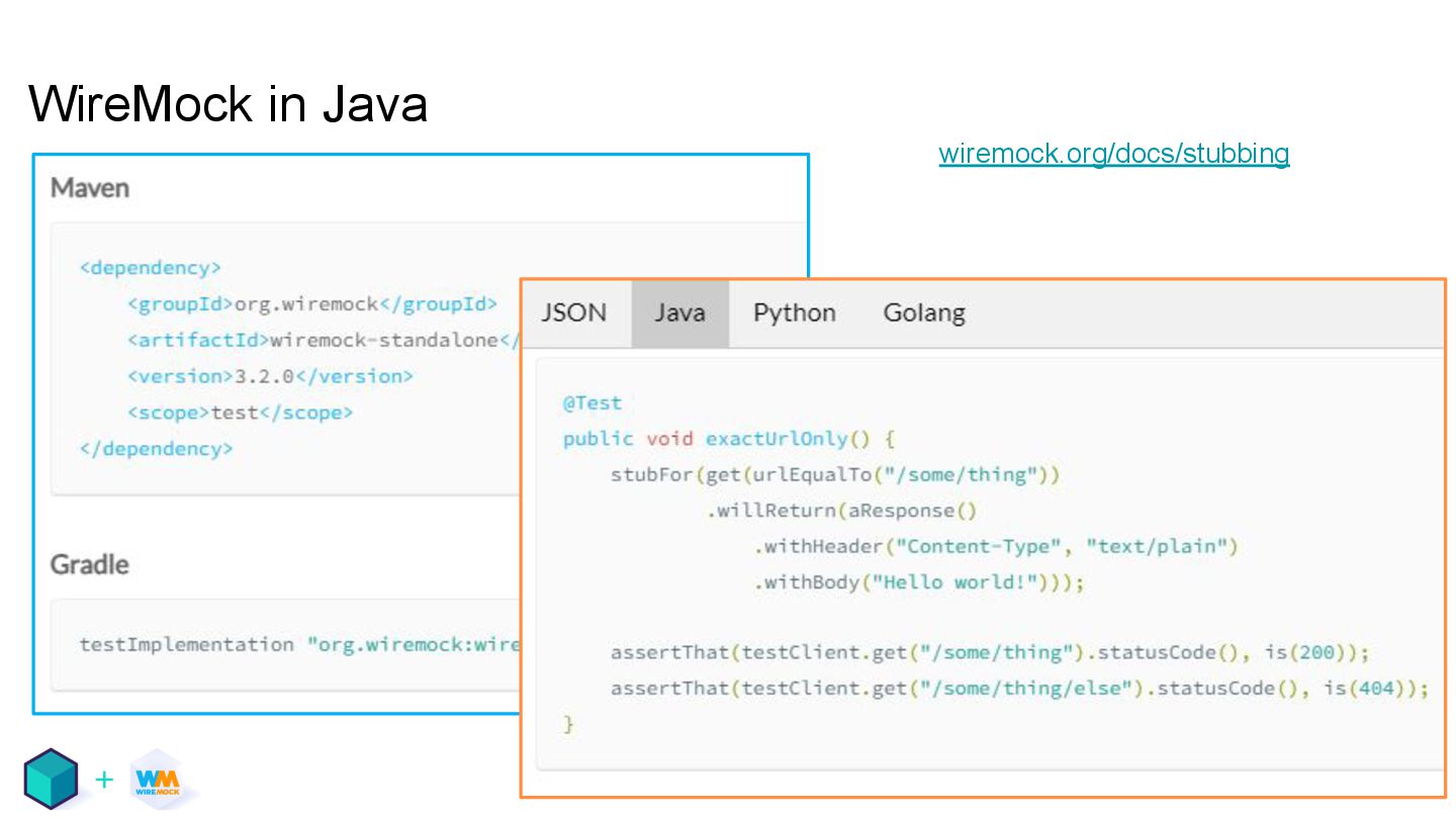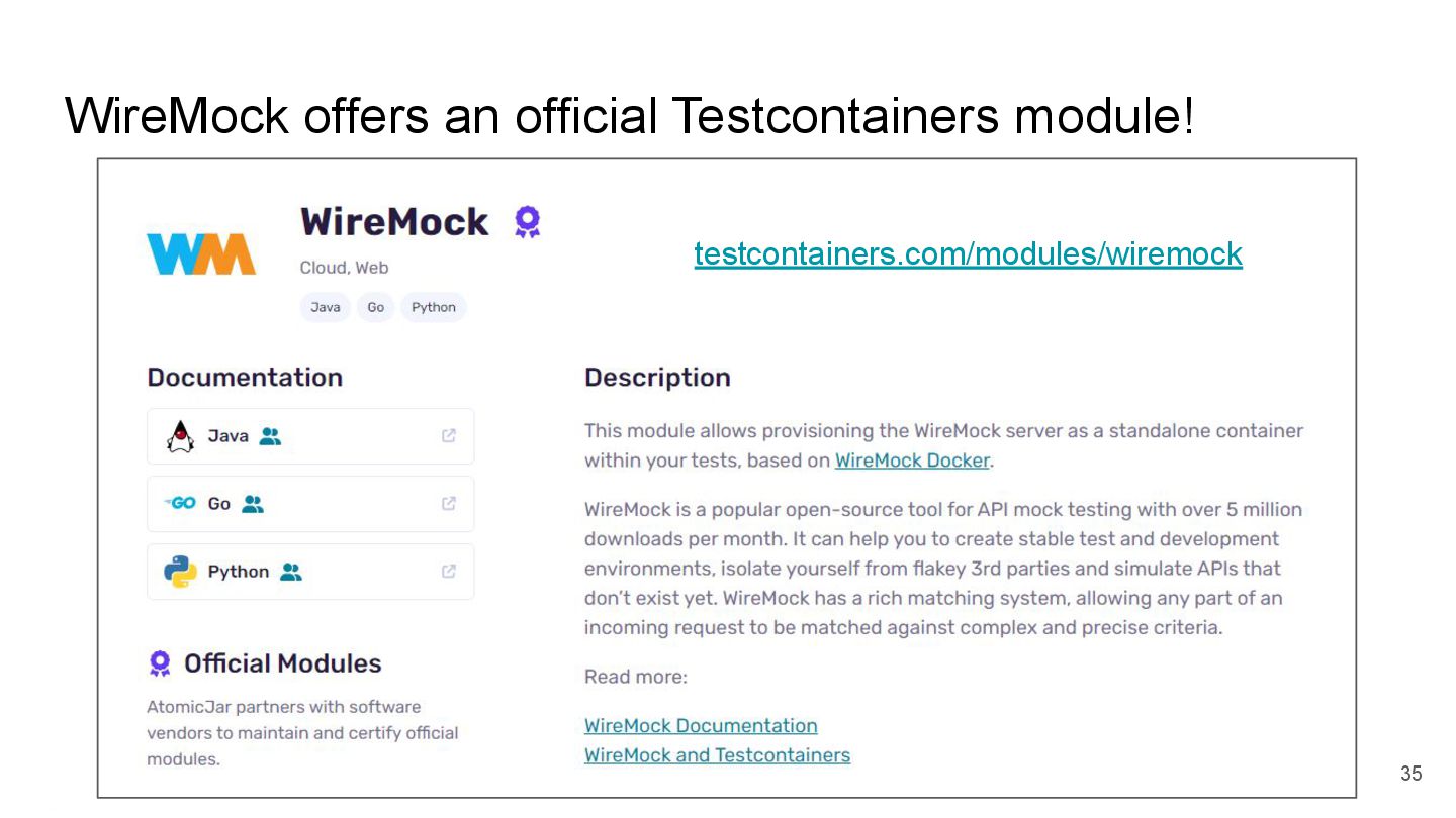 testing • Mocking APIs and services, reducing external dependencies, containers • There are tools for that, including WireMock and Testcontainers • They work well together! These slides