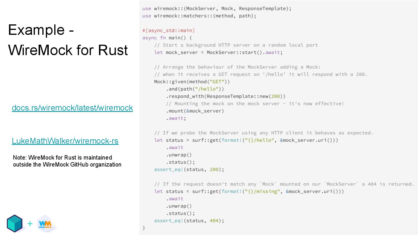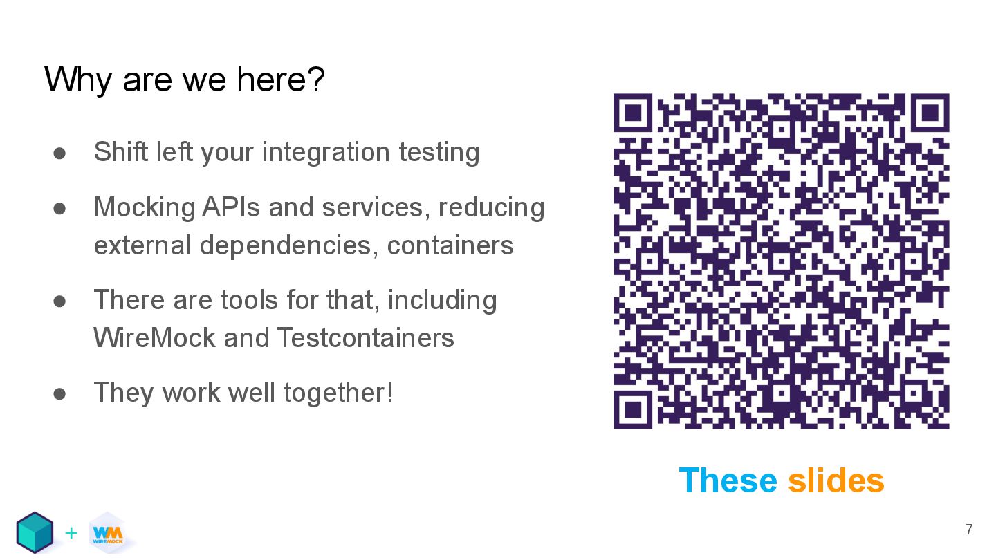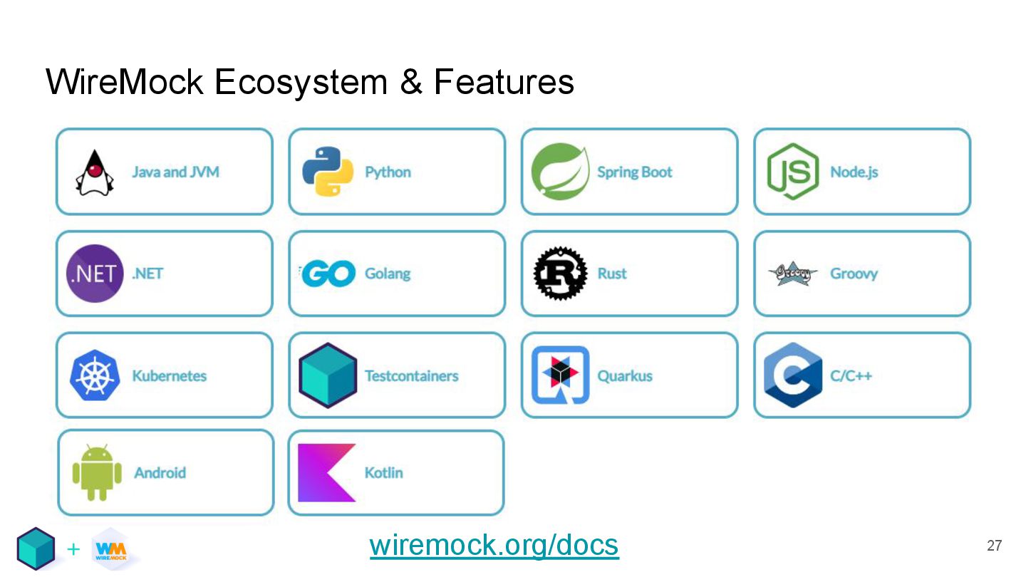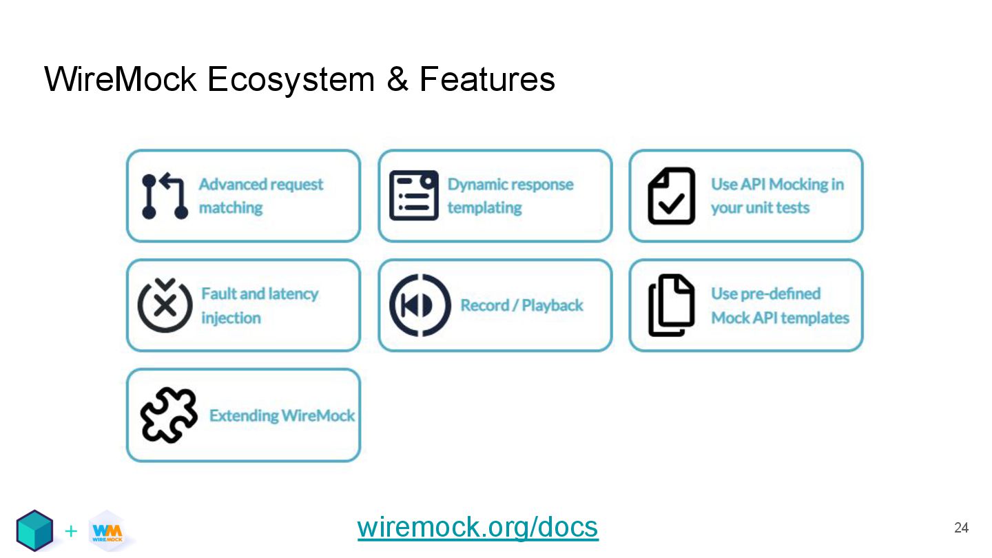 testing • Mocking APIs and services, reducing external dependencies, containers • There are tools for that, including WireMock and Testcontainers • They work well together! These slides