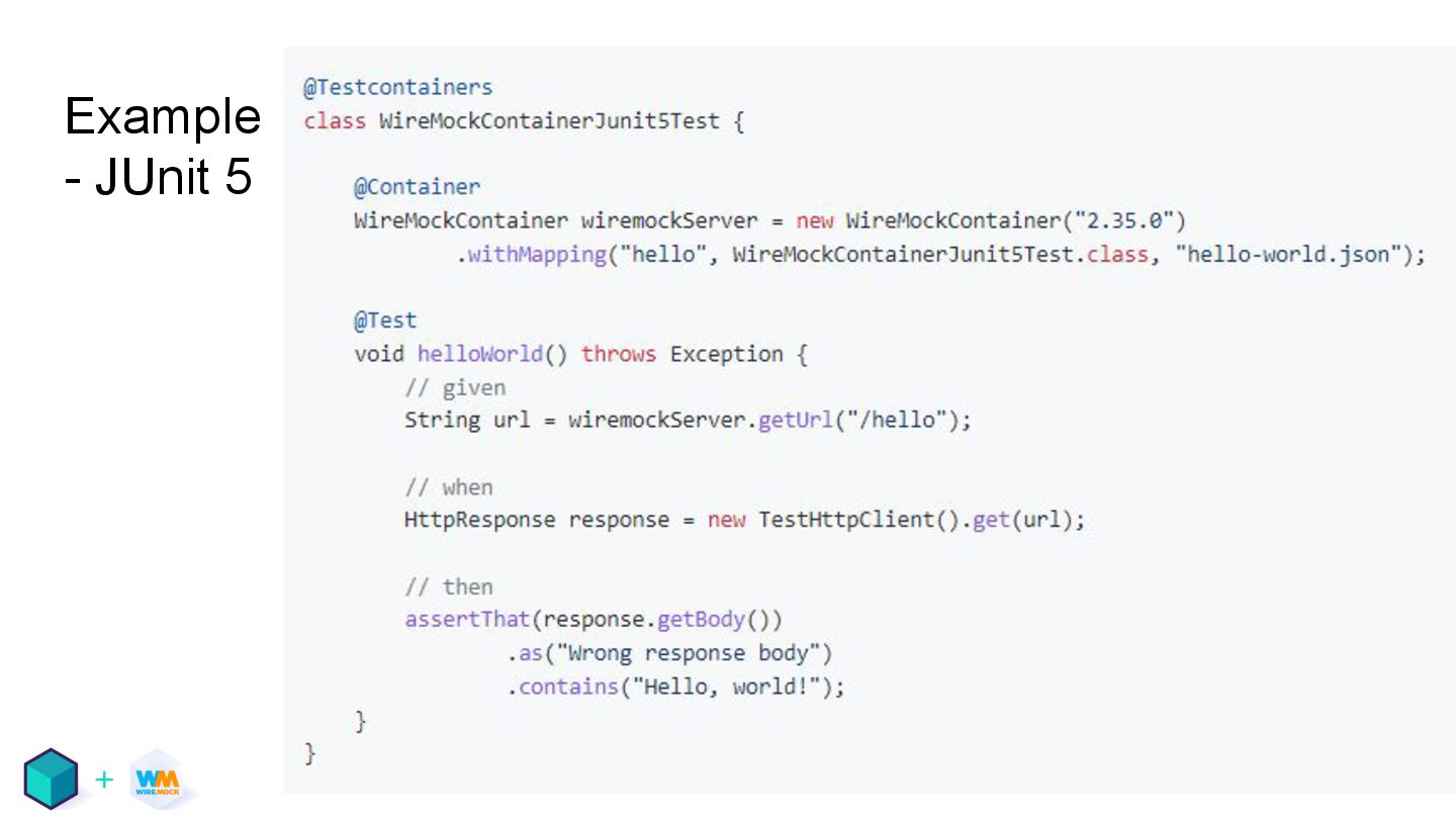 Java, Testcontainers, JUnit5 • Sources location: github.com/wiremock/wiremock-docker /tree/main/test/integration-tests