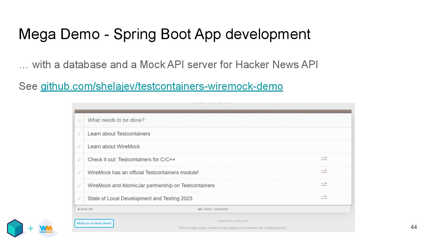 database and a Mock API server for Hacker News API See github.com/shelajev/testcontainers-wiremock-demo 44