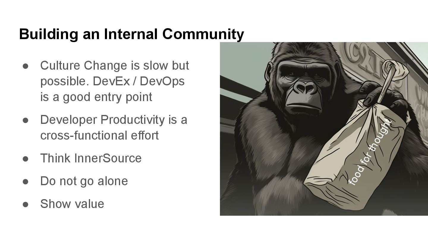 Many developers want to foster collaboration, knowledge sharing, and developer productivity—especially when those developers are their own colleagues. But do their companies really care? Despite the endless DevOps and developer productivity slidedecks, not everyone has a strategy beyond "let's form another task force" or "let's have another weekly meeting" from management. Can a single engineer actually introduce InnerSource and change how work gets done in a big enterprise? Maybe! Can they burnout in the process? Well, let's talk...